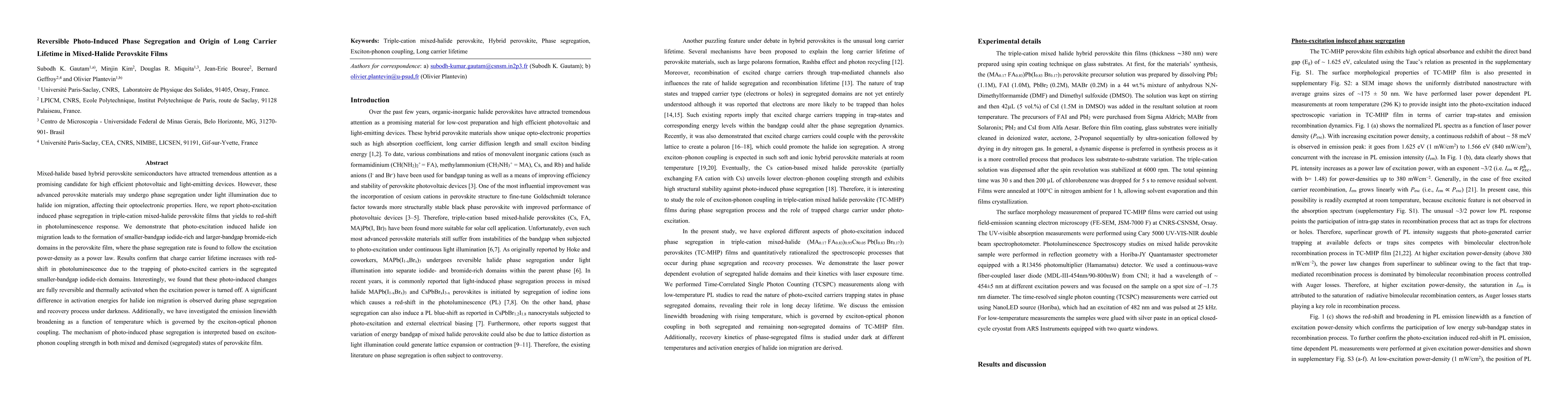This study investigates photo-induced phase segregation in mixed-halide perovskite films, revealing that light-induced halide ion migration creates iodide-rich and bromide-rich domains, enhancing carrier lifetime via trapping in iodide domains. The changes are reversible upon turning off excitation, showcasing distinct activation energies for segregation and recovery.