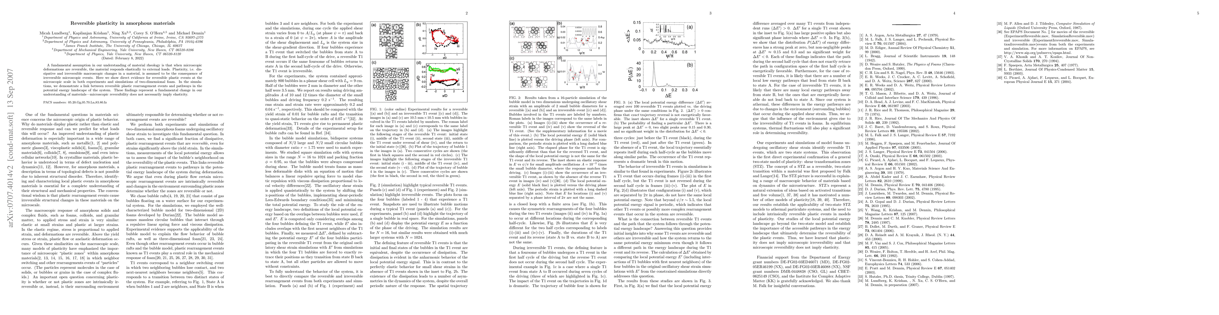 A fundamental assumption in our understanding of material rheology is that when microscopic deformations are reversible, the material responds elastically to external loads. Plasticity, i.e. dissipative and irreversible macroscopic changes in a material, is assumed to be the consequence of irreversible microscopic events. Here we show direct evidence for reversible plastic events at the microscopic scale in both experiments and simulations of two-dimensional foam. In the simulations, we demonstrate a link between reversible plastic rearrangement events and pathways in the potential energy landscape of the system. These findings represent a fundamental change in our understanding of materials--microscopic reversibility does not necessarily imply elasticity.