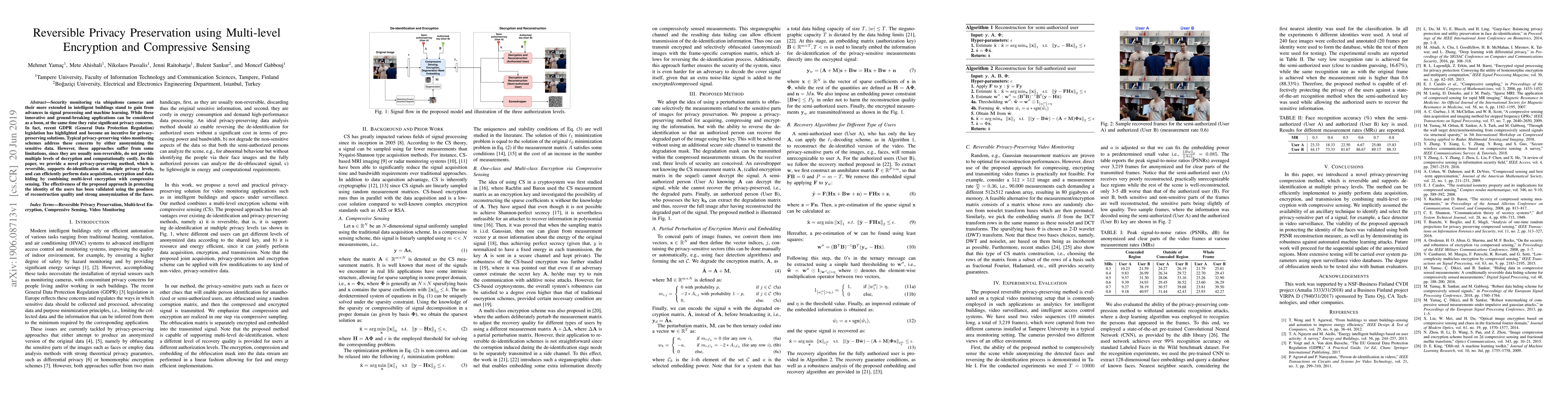 This paper proposes a reversible privacy-preserving method using multi-level encryption and compressive sensing for security monitoring in intelligent buildings. The approach offers de-identification at multiple levels, efficient data acquisition, and strong anonymization while maintaining reconstruction quality.