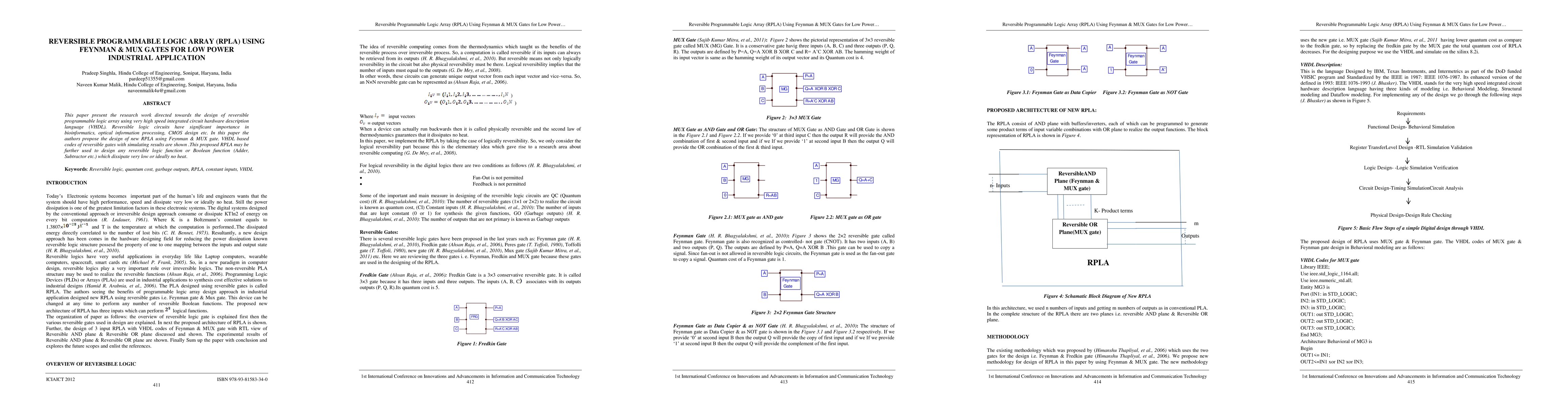 This paper proposes a novel reversible programmable logic array (RPLA) using Feynman and MUX gates, designed in VHDL to minimize power dissipation, making it ideal for low power industrial applications. The RPLA demonstrates low or zero heat dissipation, enhancing its utility in fields like bioinformatics and CMOS design.