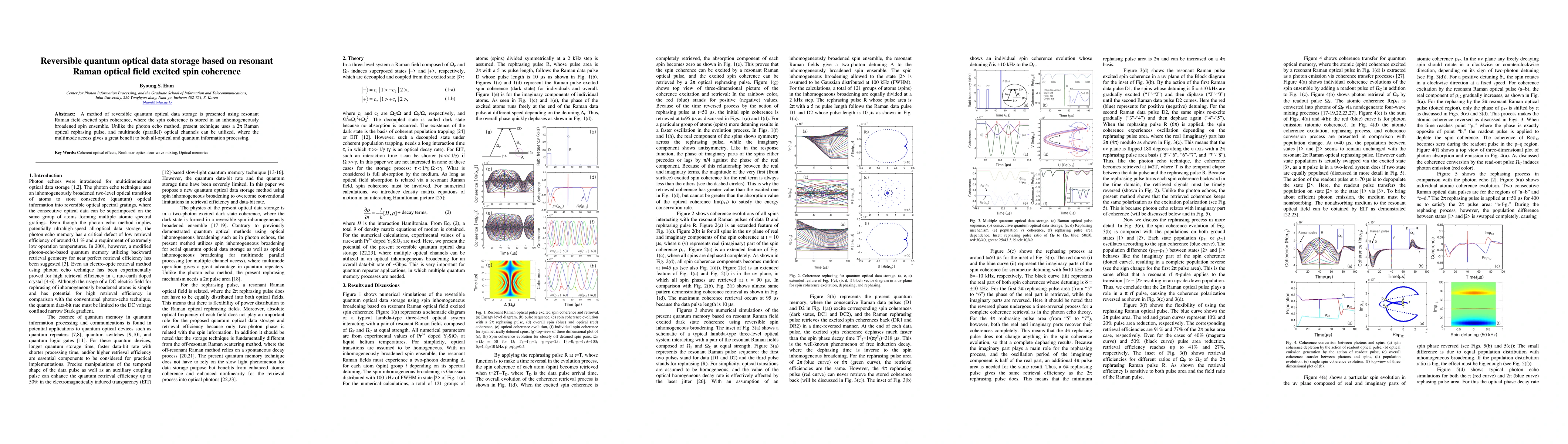 This paper proposes a reversible quantum optical data storage technique utilizing resonant Raman field excited spin coherence, which stores spin coherence in an inhomogeneously broadened spin ensemble. The method leverages a 2π Raman optical rephasing pulse and allows for parallel optical channels, enhancing both all-optical and quantum information processing.