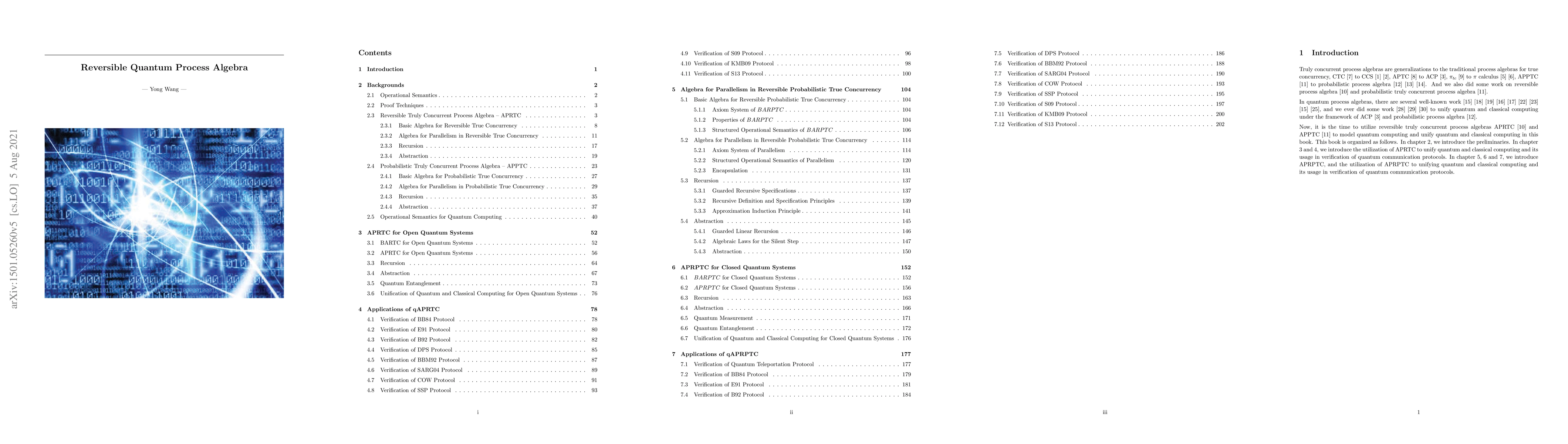 Truly concurrent process algebras are generalizations to the traditional process algebras for true concurrency, CTC to CCS, APTC to ACP, $\pi_{tc}$ to $\pi$ calculus , APPTC to probabilistic process algebra. And we also did some work on reversible process algebra and probabilistic truly concurrent process algebra. In this book, we utilize reversible truly concurrent process algebras APRTC and APPTC to model quantum computing and unify quantum and classical computing.
