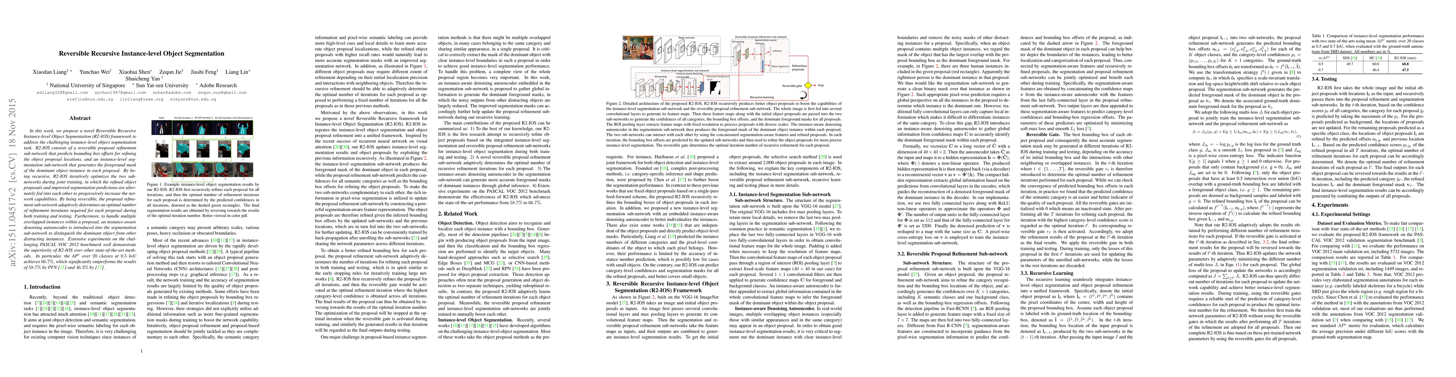 This paper introduces a Reversible Recursive Instance-level Object Segmentation (R2-IOS) framework that iteratively refines object proposals and segmentations to improve instance-level segmentation accuracy. The framework achieves superior performance on the PASCAL VOC 2012 benchmark, outperforming other state-of-the-art methods with an $\text{AP}^r$ of $66.7\%$.