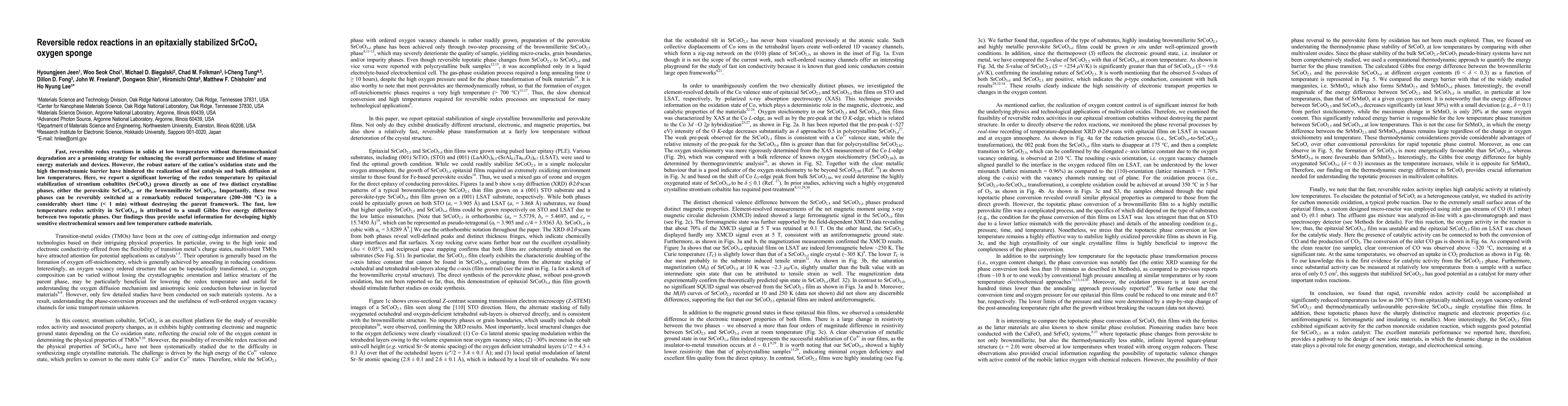 Fast, reversible redox reactions in solids at low temperatures without thermomechanical degradation are a promising strategy for enhancing the overall performance and lifetime of many energy materials and devices. However, the robust nature of the cation's oxidation state and the high thermodynamic barrier have hindered the realization of fast catalysis and bulk diffusion at low temperatures. Here, we report a significant lowering of the redox temperature by epitaxial stabilization of strontium cobaltites (SrCoOx) grown directly as one of two distinct crystalline phases, either the perovskite SrCoO3-{\delta} or the brownmillerite SrCoO2.5. Importantly, these two phases can be reversibly switched at a remarkably reduced temperature (200~300 {\deg}C) in a considerably short time (< 1 min) without destroying the parent framework. The fast, low temperature redox activity in SrCoO3-{\delta} is attributed to a small Gibbs free energy difference between two topotatic phases. Our findings thus provide useful information for developing highly sensitive electrochemical sensors and low temperature cathode materials.