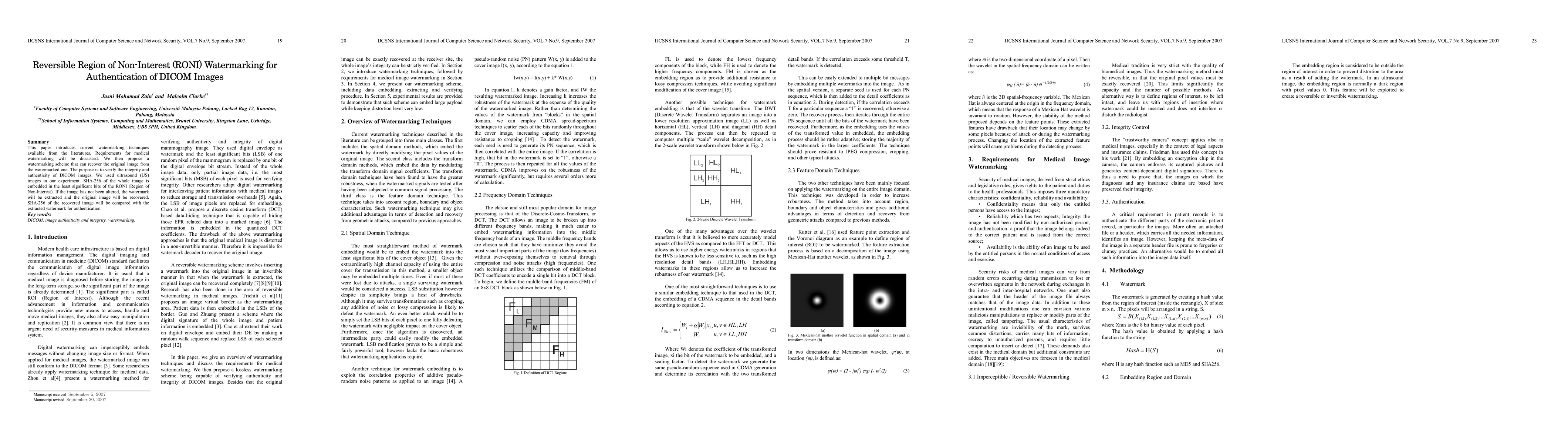 This paper introduces current watermarking techniques available from the literatures. Requirements for medical watermarking will be discussed. We then propose a watermarking scheme that can recover the original image from the watermarked one. The purpose is to verify the integrity and authenticity of DICOM images. We used ultrasound (US) images in our experiment. SHA-256 of the whole image is embedded in the least significant bits of the RONI (Region of Non-Interest). If the image has not been altered, the watermark will be extracted and the original image will be recovered. SHA-256 of the recovered image will be compared with the extracted watermark for authentication.