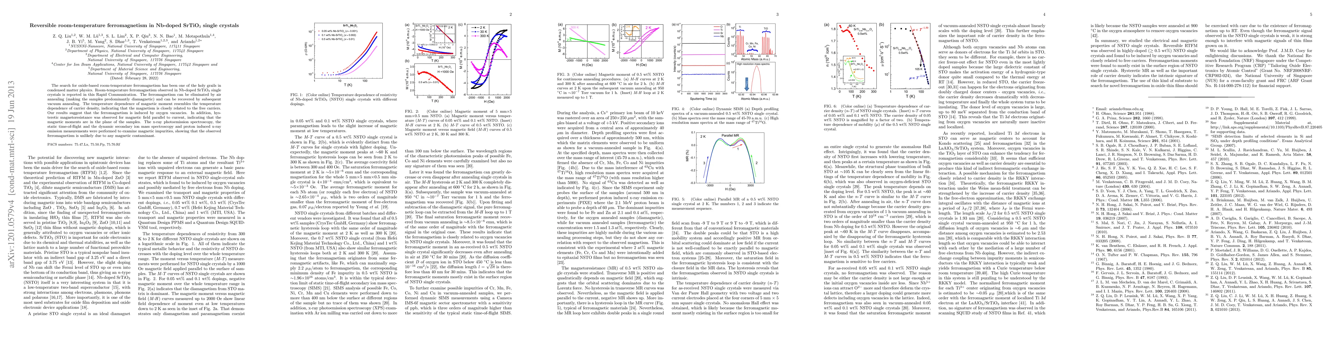 This paper reports room-temperature ferromagnetism in Nb-doped SrTiO3 single crystals, which is reversible through air and vacuum annealing, suggesting oxygen vacancies induce the magnetism. The observed ferromagnetism is not due to magnetic impurities, as confirmed by various spectroscopic techniques.