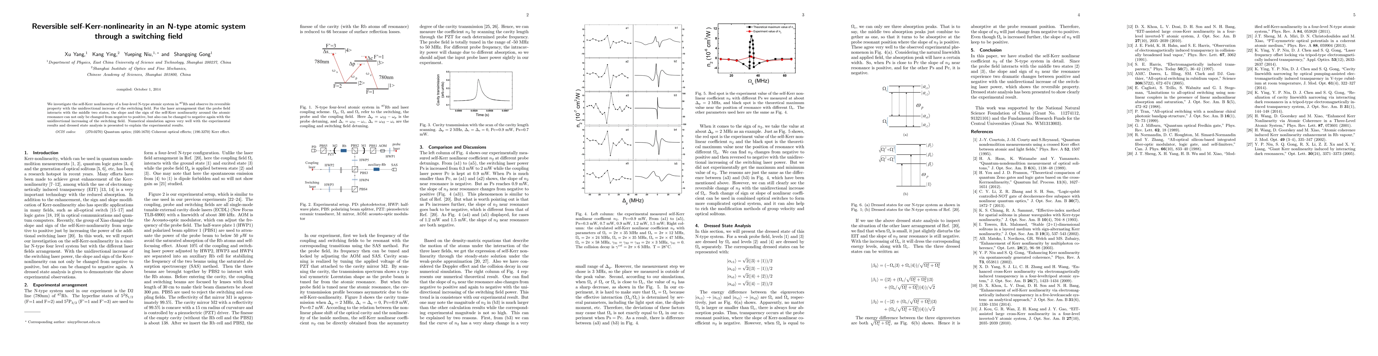 We investigate the self-Kerr nonlinearity of a four-level N-type atomic system in 87Rb and observe its reversible property with the unidirectional increase of the switching field. For the laser arrangement that the probe field interacts with the middle two states, the slope and the sign of the self-Kerr nonlinearity around the atomic resonance can not only be changed from negative to positive, but also can be changed to negative again with the unidirectional increasing of the switching field. Numerical simulation agrees very well with the experimental results and dressed state analysis is presented to explain the experimental results.