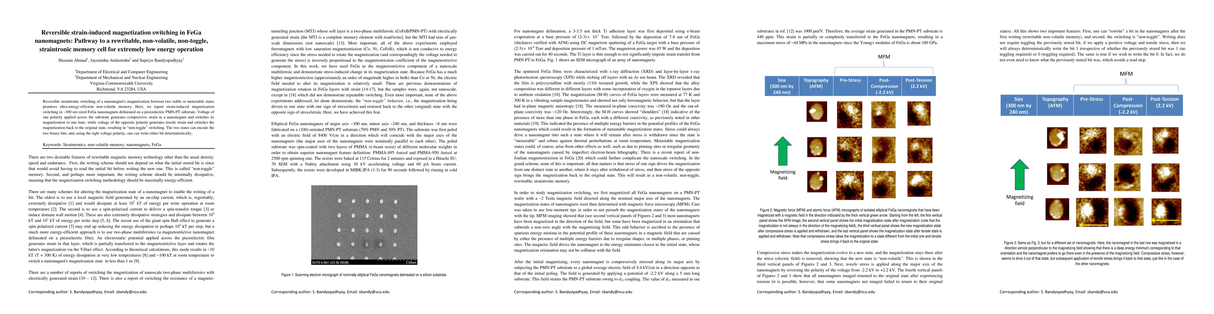 This paper reports on reversible strain-induced magnetization switching in FeGa nanomagnets on a piezoelectric substrate, enabling a non-volatile, non-toggle straintronic memory cell for ultra-energy-efficient data storage. The applied voltage generates compressive or tensile strain to switch the nanomagnet's magnetization between two states, allowing deterministic writing of binary bits.