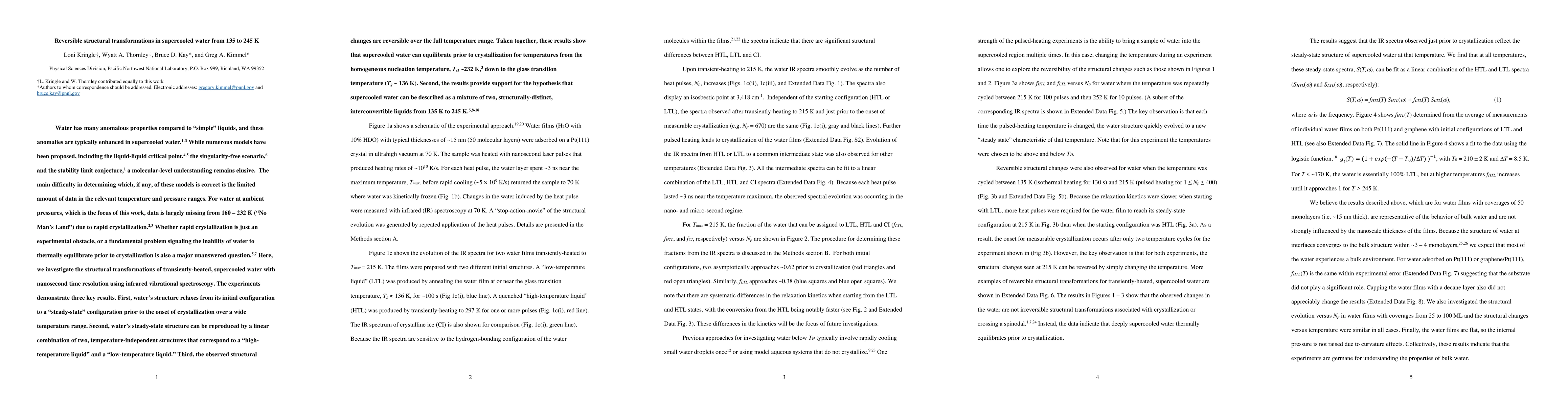 Water has many anomalous properties compared to "simple" liquids, and these anomalies are typically enhanced in supercooled water. While numerous models have been proposed, including the liquid-liquid critical point, the singularity-free scenario, and the stability limit conjecture, a molecular-level understanding remains elusive.The main difficulty in determining which, if any, of these models is correct is the limited amount of data in the relevant temperature and pressure ranges. For water at ambient pressures, which is the focus of this work, data is largely missing from 160 - 232 K due to rapid crystallization. Whether rapid crystallization is just an experimental obstacle, or a fundamental problem signaling the inability of water to thermally equilibrate prior to crystallization is also a major unanswered question. Here, we investigate the structural transformations of transiently-heated, supercooled water with nanosecond time resolution using infrared vibrational spectroscopy. The experiments demonstrate three key results. First, water's structure relaxes from its initial configuration to a "steady-state" configuration prior to the onset of crystallization over a wide temperature range. Second, water's steady-state structure can be reproduced by a linear combination of two, temperature-independent structures that correspond to a "high-temperature liquid" and a "low-temperature liquid." Third, the observed structural changes are reversible over the full temperature range. Taken together, these results show that supercooled water can equilibrate prior to crystallization for temperatures from the homogeneous nucleation temperature down to the glass transition temperature. Second, the results provide support for the hypothesis that supercooled water can be described as a mixture of two, structurally-distinct, interconvertible liquids from 135 K to 245 K.