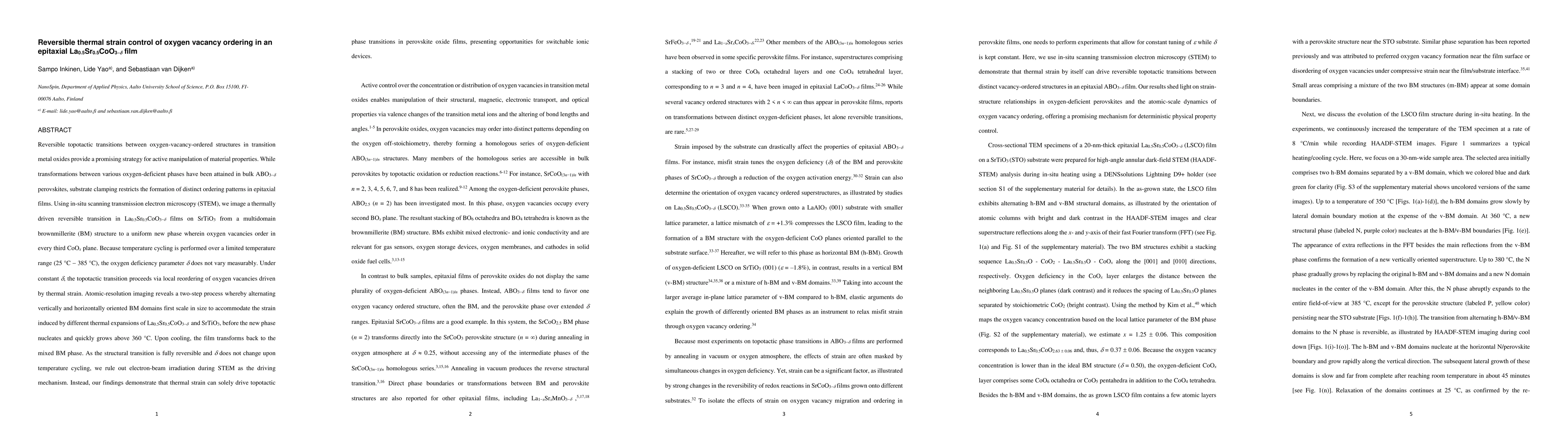 This paper demonstrates reversible thermal strain-induced transitions between oxygen-vacancy-ordered structures in epitaxial La$_{0.5}$Sr$_{0.5}$CoO$_{3-\delta}$ films, using in-situ STEM. The study shows that thermal cycling drives a topotactic phase transition without altering the oxygen deficiency, indicating thermal strain as the primary mechanism.