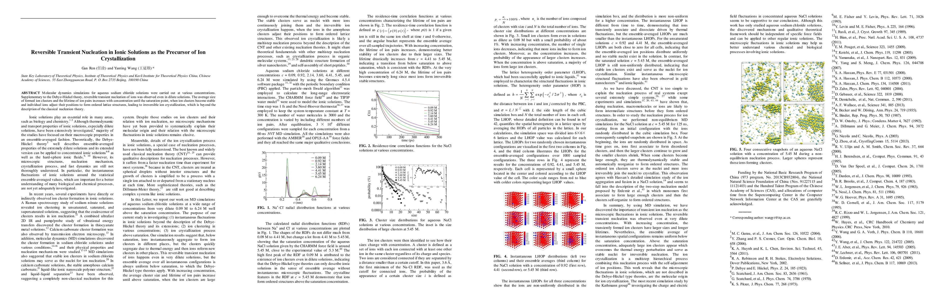 This study uses molecular dynamics simulations to reveal reversible transient nucleation in aqueous sodium chloride solutions, showing that ion clusters grow and stabilize with concentration until they form ordered lattice structures, leading to irreversible crystallization beyond classical nucleation theory.