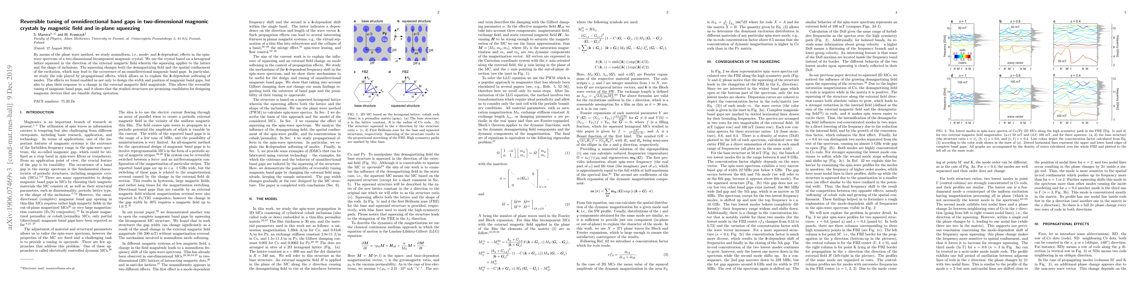 By means of the plane wave method, we study nonuniform, i.e., mode- and k-dependent, effects in the spin-wave spectrum of a two-dimensional bicomponent magnonic crystal. We use the crystal based on a hexagonal lattice squeezed in the direction of the external magnetic field wherein the squeezing applies to the lattice and the shape of inclusions. The squeezing changes both the demagnetizing field and the spatial confinement of the excitation, which may lead to the occurrence of an omnidirectional magnonic band gaps. In particular, we study the role played by propagational effects, which allows us to explain the k-dependent softening of modes. The effects we found enabled us not only to design the width and position of magnonic band gaps, but also to plan their response to a change in the external magnetic field magnitude. This allows the reversible tuning of magnonic band gaps, and it shows that the studied structures are promising candidates for designing magnonic devices that are tunable during operation.