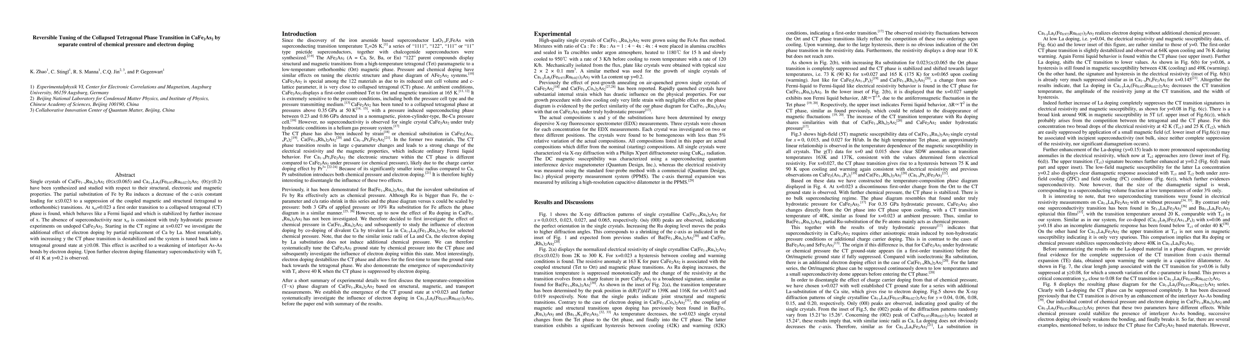 This study investigates the structural and electronic properties of Ca(Fe1-xRux)2As2 and Ca1-yLay(Fe0.973Ru0.027)2As2, revealing that Ru substitution suppresses tetragonal to orthorhombic transitions and induces a collapsed tetragonal phase. Electron doping via La substitution destabilizes this phase, restoring tetragonality and inducing superconductivity at higher doping levels.