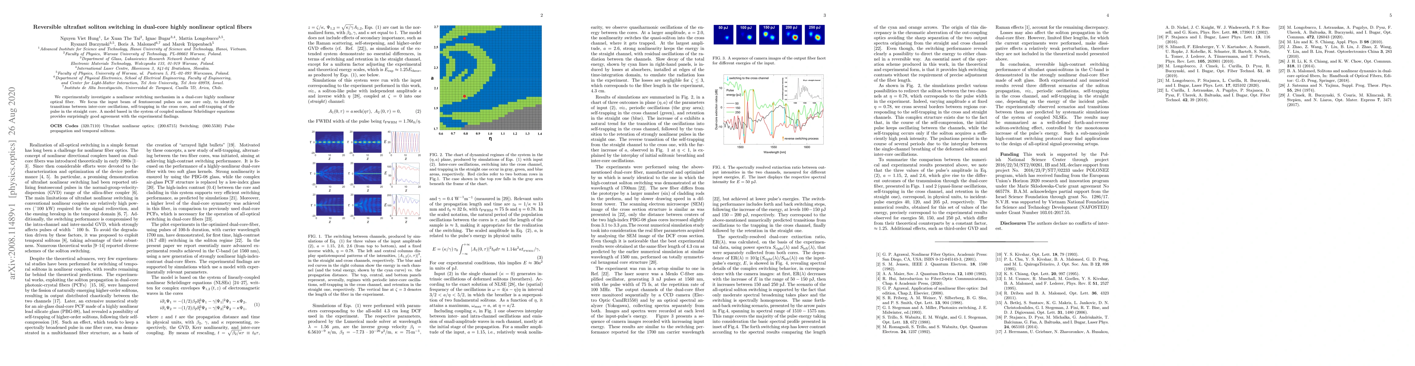 This paper explores reversible ultrafast soliton switching in dual-core highly nonlinear optical fibers using femtosecond pulses, identifying transitions between inter-core oscillations and self-trapping. A coupled nonlinear Schrödinger equation model accurately predicts the observed nonlinear switching behavior.