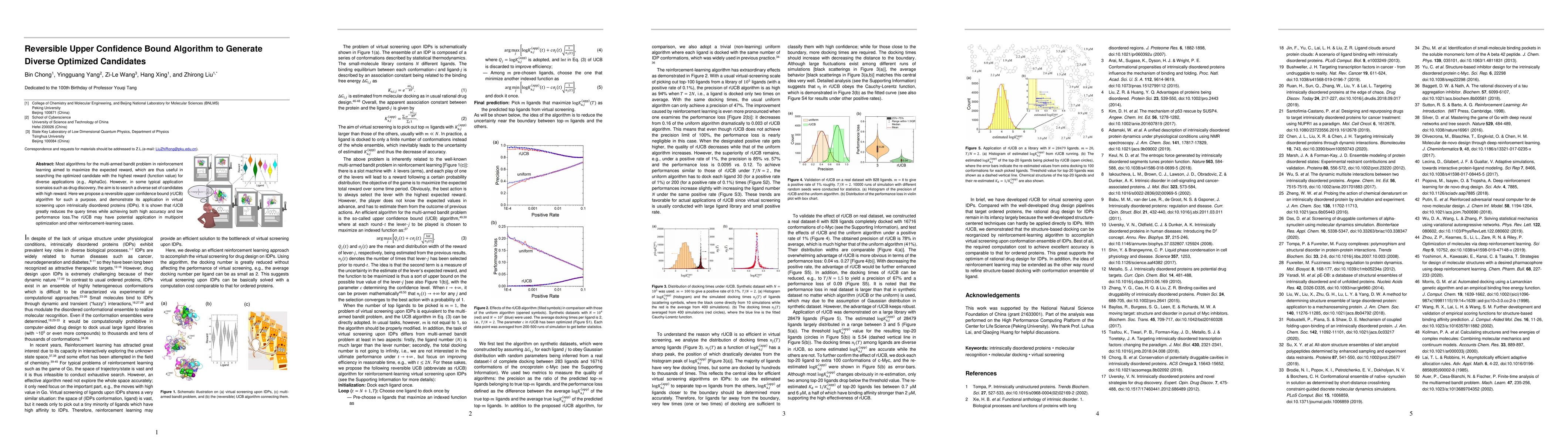 The paper proposes a reversible upper confidence bound (rUCB) algorithm for generating diverse optimized candidates, specifically demonstrated in virtual screening upon intrinsically disordered proteins (IDPs). The algorithm aims to reduce query times while maintaining high accuracy and low performance loss.