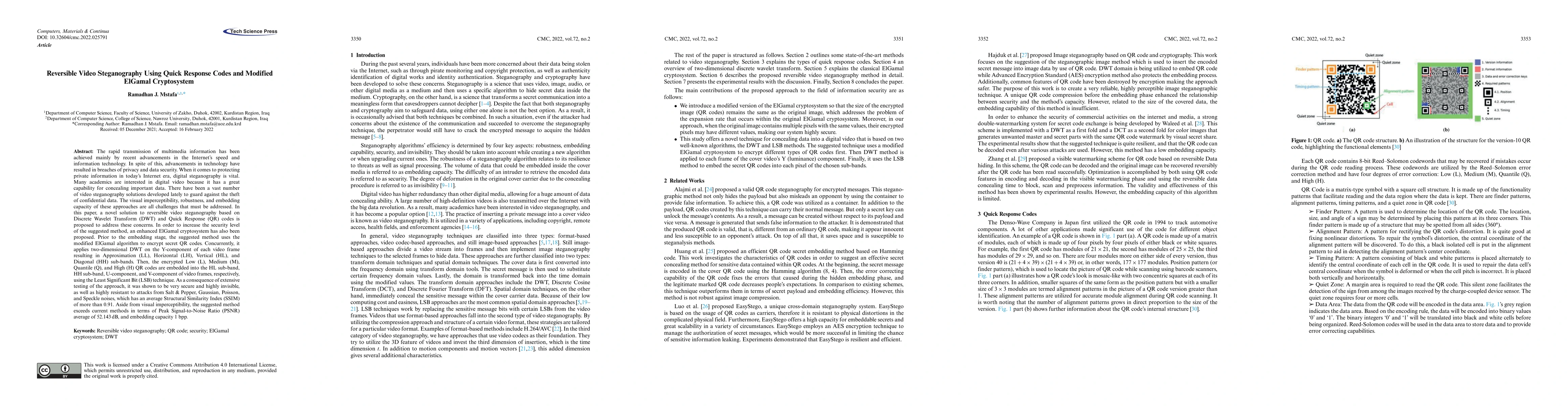 The paper proposes a reversible video steganography method using DWT and a modified ElGamal cryptosystem with different types of QR codes. The secret information is encrypted using a modified ElGamal algorithm before embedding, and 2D-DWT is applied to the Y-component of each video frame for hiding encrypted QR codes.