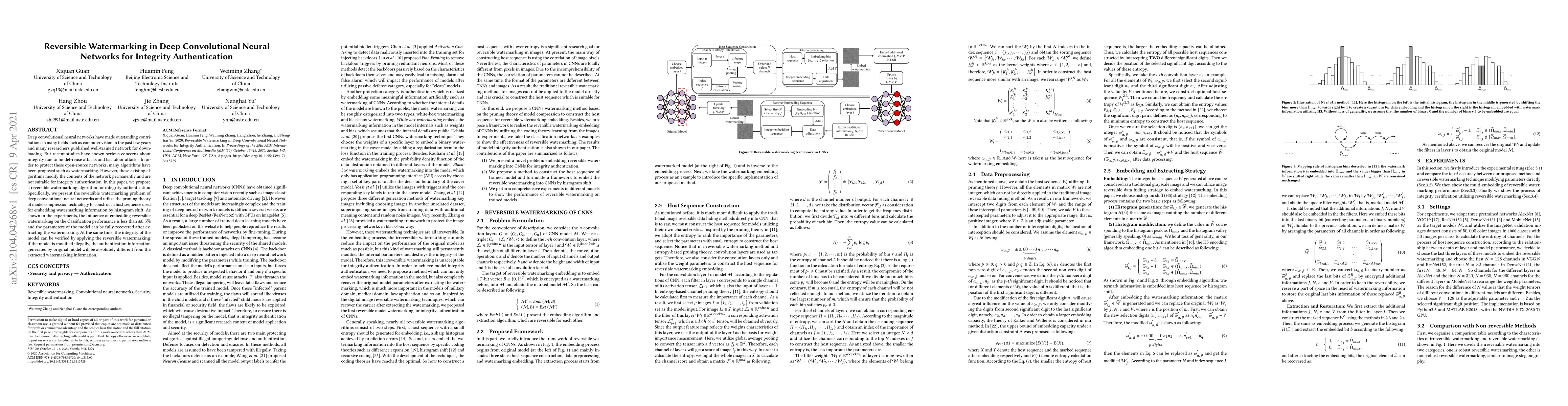 This paper introduces a reversible watermarking algorithm for integrity authentication in deep convolutional neural networks. The proposed method leverages model compression techniques to embed watermarks without permanently altering the network, ensuring minimal impact on classification performance and full recovery of model parameters post-extraction.