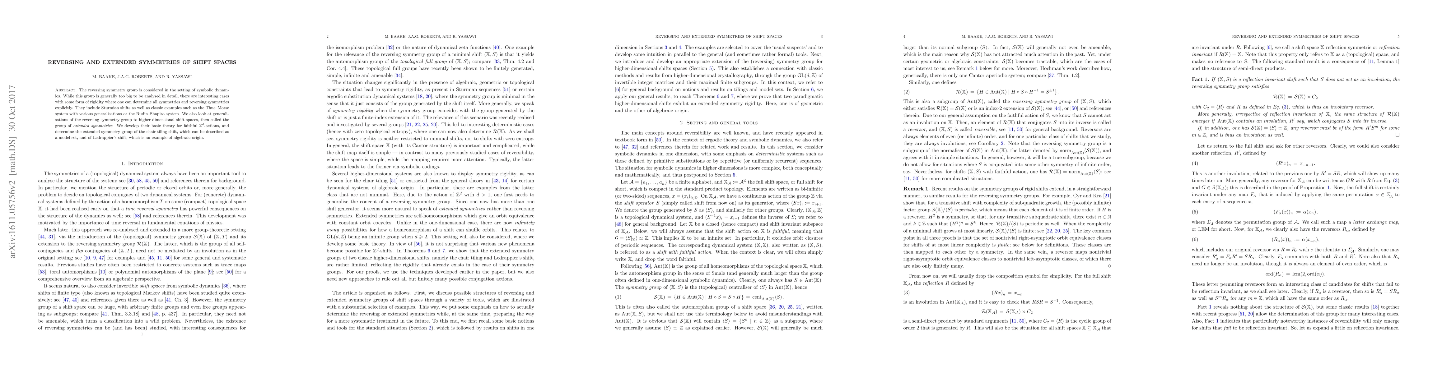 The reversing symmetry group is considered in the setting of symbolic dynamics. While this group is generally too big to be analysed in detail, there are interesting cases with some form of rigidity where one can determine all symmetries and reversing symmetries explicitly. They include Sturmian shifts as well as classic examples such as the Thue--Morse system with various generalisations or the Rudin--Shapiro system. We also look at generalisations of the reversing symmetry group to higher-dimensional shift spaces, then called the group of \emph{extended symmetries}. We develop their basic theory for faithful $\mathbb{Z}^{d}$-actions, and determine the extended symmetry group of the chair tiling shift, which can be described as a model set, and of Ledrappier's shift, which is an example of algebraic origin.