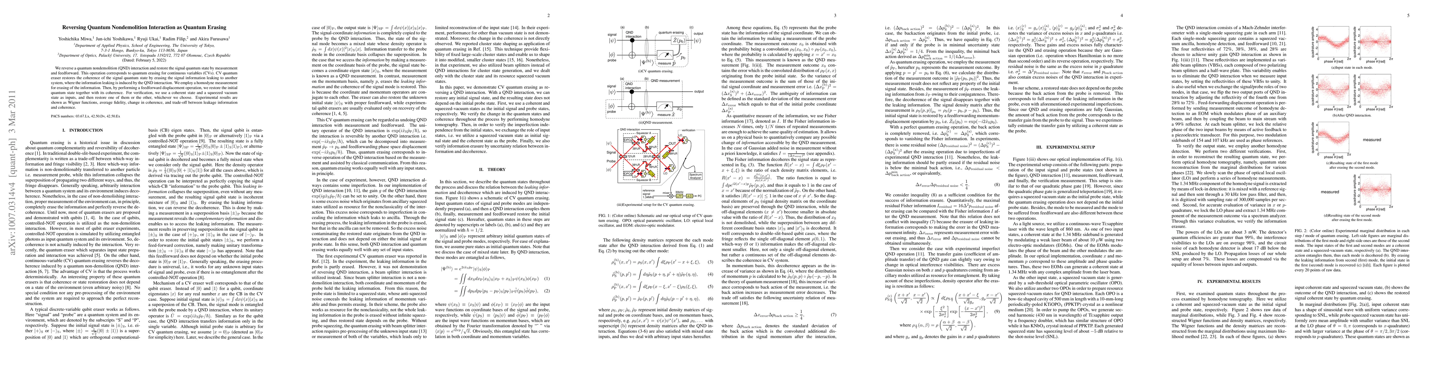 This paper demonstrates the reversal of quantum nondemolition interactions through quantum erasing, restoring coherence in continuous variable quantum states by erasing leaked information using homodyne measurement and feedforward displacement. Experimental results verify the restoration of initial quantum states using coherent and squeezed vacuum states.