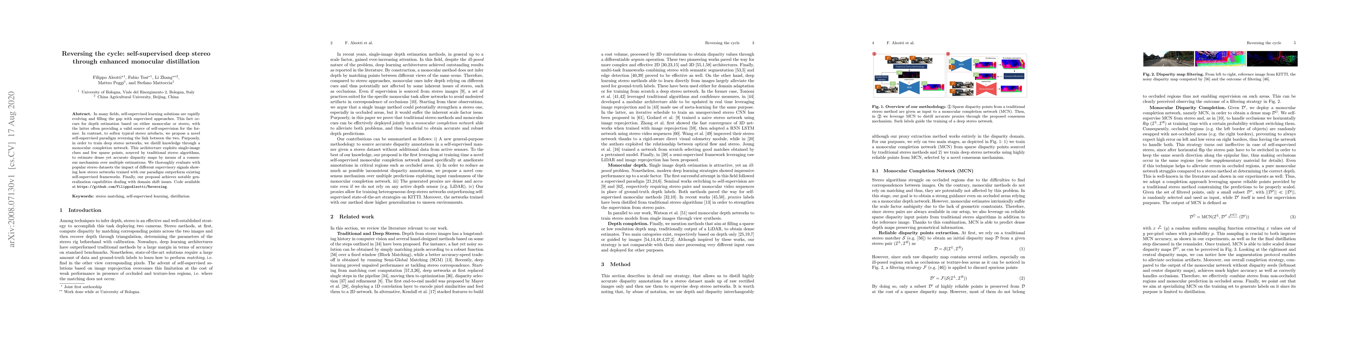 This paper proposes a novel self-supervised deep stereo learning method that reverses the typical monocular-to-stereo knowledge transfer by distilling monocular completion through sparse stereo points. The method achieves superior depth estimation and demonstrates strong generalization across different datasets.