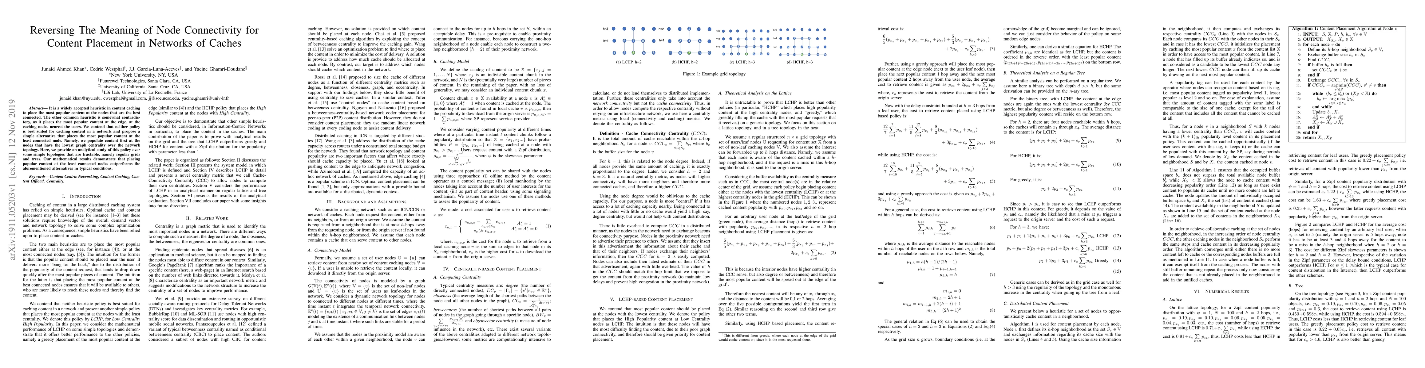 It is a widely accepted heuristic in content caching to place the most popular content at the nodes that are the best connected. The other common heuristic is somewhat contradictory, as it places the most popular content at the edge, at the caching nodes nearest the users. We contend that neither policy is best suited for caching content in a network and propose a simple alternative that places the most popular content at the least connected node. Namely, we populate content first at the nodes that have the lowest graph centrality over the network topology. Here, we provide an analytical study of this policy over some simple topologies that are tractable, namely regular grids and trees. Our mathematical results demonstrate that placing popular content at the least connected nodes outperforms the aforementioned alternatives in typical conditions.