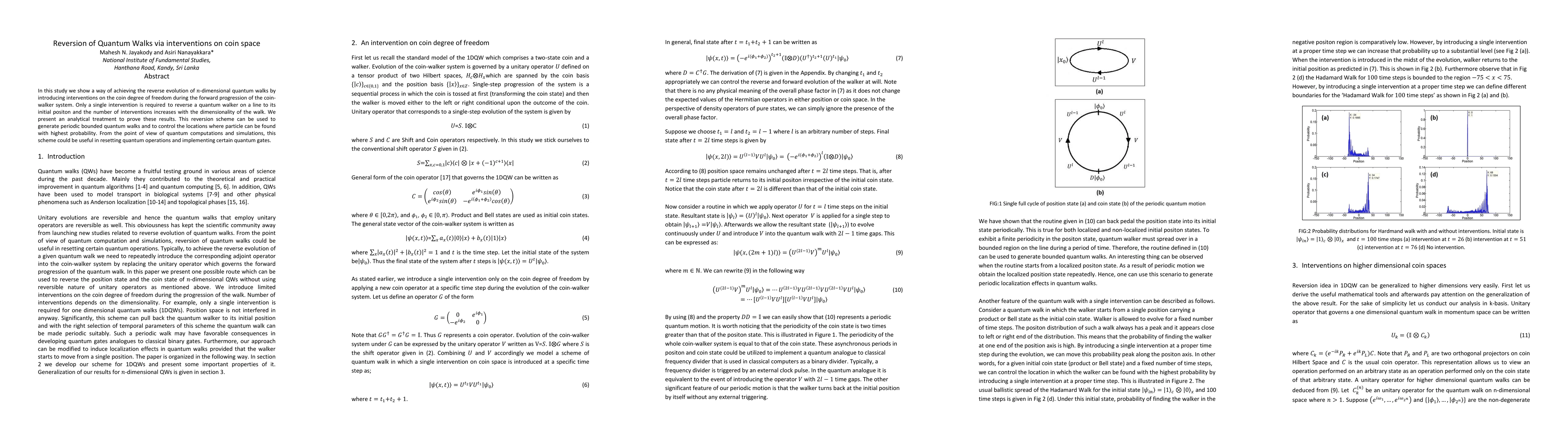 In this study we show a way of achieving the reverse evolution of n-dimensional quantum walks by introducing interventions on the coin degree of freedom during the forward progression of the coin-walker system. Only a single intervention is required to reverse a quantum walker on a line to its initial positon and the number of interventions increases with the dimensionality of the walk. We present an analytical treatment to prove these results. This reversion scheme can be used to generate periodic bounded quantum walks and to control the locations where particle can be found with highest probability. From the point of view of quantum computations and simulations, this scheme could be useful in resetting quantum operations and implementing certain quantum gates.