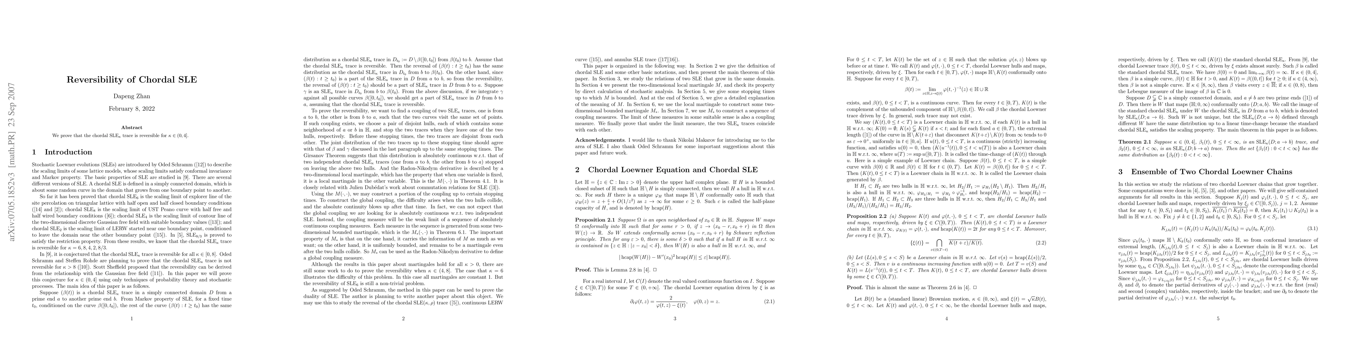 This research demonstrates that the chordal SLE$_\kappa$ process exhibits reversibility for values of $\kappa$ within the range $(0,4]$. This finding has implications for understanding the stochastic behavior of related processes in two-dimensional quantum gravity.