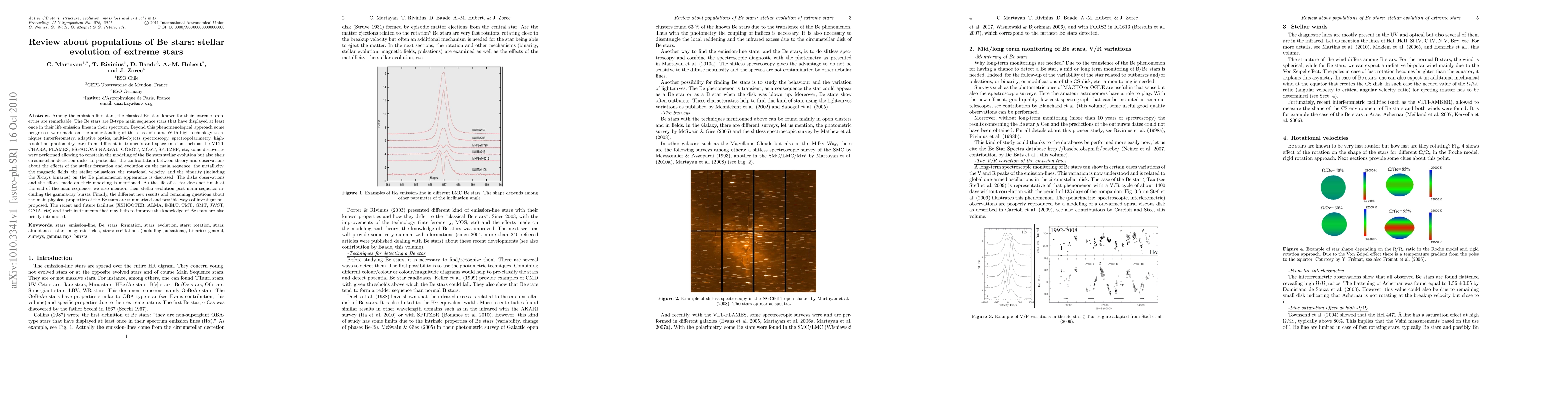 Among the emission-line stars, the classical Be stars known for their extreme properties are remarkable. The Be stars are B-type main sequence stars that have displayed at least once in their life emission lines in their spectrum. Beyond this phenomenological approach some progresses were made on the understanding of this class of stars. With high-technology techniques (interferometry, adaptive optics, multi-objects spectroscopy, spectropolarimetry, high-resolution photometry, etc) from different instruments and space mission such as the VLTI, CHARA, FLAMES, ESPADONS-NARVAL, COROT, MOST, SPITZER, etc, some discoveries were performed allowing to constrain the modelling of the Be stars stellar evolution but also their circumstellar decretion disks. In particular, the confrontation between theory and observations about the effects of the stellar formation and evolution on the main sequence, the metallicity, the magnetic fields, the stellar pulsations, the rotational velocity, and the binarity (including the X-rays binaries) on the Be phenomenon appearance is discussed. The disks observations and the efforts made on their modelling is mentioned. As the life of a star does not finish at the end of the main sequence, we also mention their stellar evolution post main sequence including the gamma-ray bursts. Finally, the different new results and remaining questions about the main physical properties of the Be stars are summarized and possible ways of investigations proposed. The recent and future facilities (XSHOOTER, ALMA, E-ELT, TMT, GMT, JWST, GAIA, etc) and their instruments that may help to improve the knowledge of Be stars are also briefly introduced.