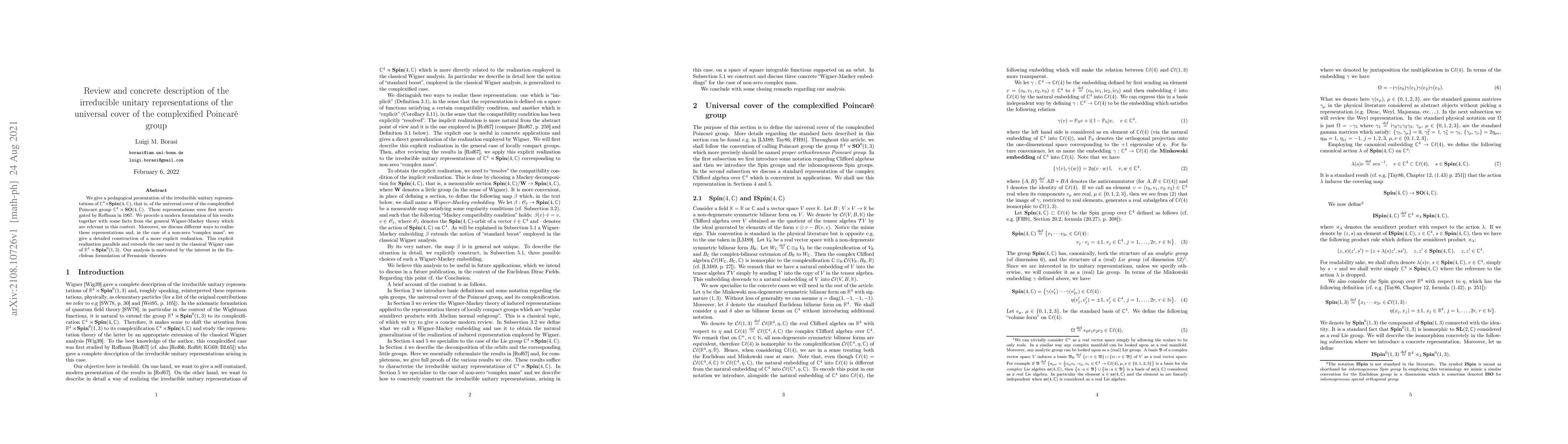 We give a pedagogical presentation of the irreducible unitary representations of $\mathbb{C}^4\rtimes\mathbf{Spin}(4,\mathbb{C})$, that is, of the universal cover of the complexified Poincar\'e group $\mathbb{C}^4\rtimes\mathbf{SO}(4,\mathbb{C})$. These representations were first investigated by Roffman in 1967. We provide a modern formulation of his results together with some facts from the general Wigner-Mackey theory which are relevant in this context. Moreover, we discuss different ways to realize these representations and, in the case of a non-zero "complex mass", we give a detailed construction of a more explicit realization. This explicit realization parallels and extends the one used in the classical Wigner case of $\mathbb{R}^4\rtimes\mathbf{Spin}^0(1,3)$. Our analysis is motivated by the interest in the Euclidean formulation of Fermionic theories.