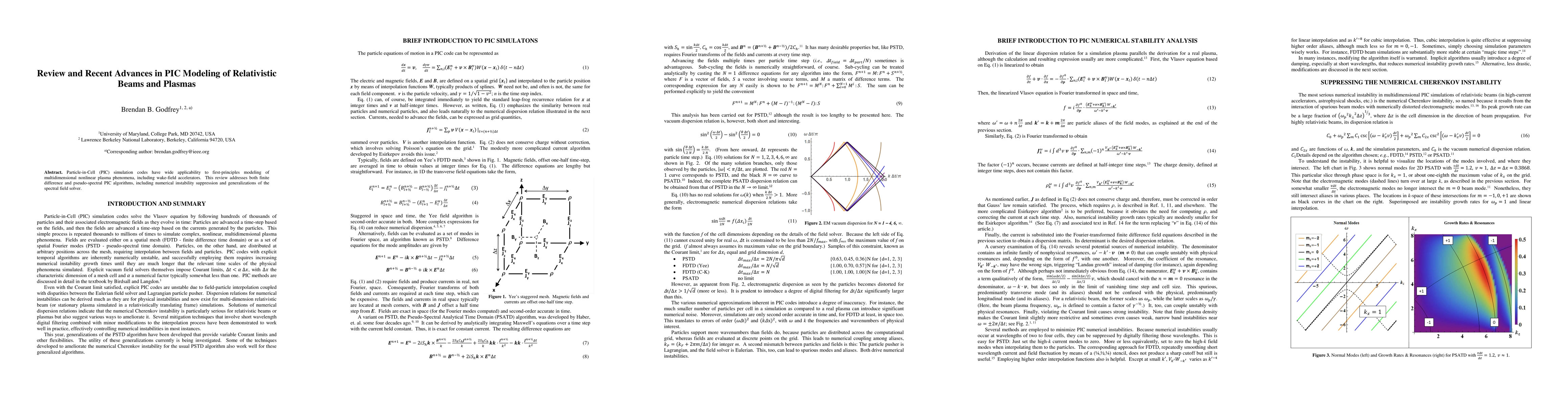 Summary: This review explores advanced Particle-in-Cell (PIC) simulation methods for modeling relativistic beams and plasmas, focusing on finite difference and pseudo-spectral algorithms, and discusses techniques to mitigate numerical instability and enhance spectral field solvers.