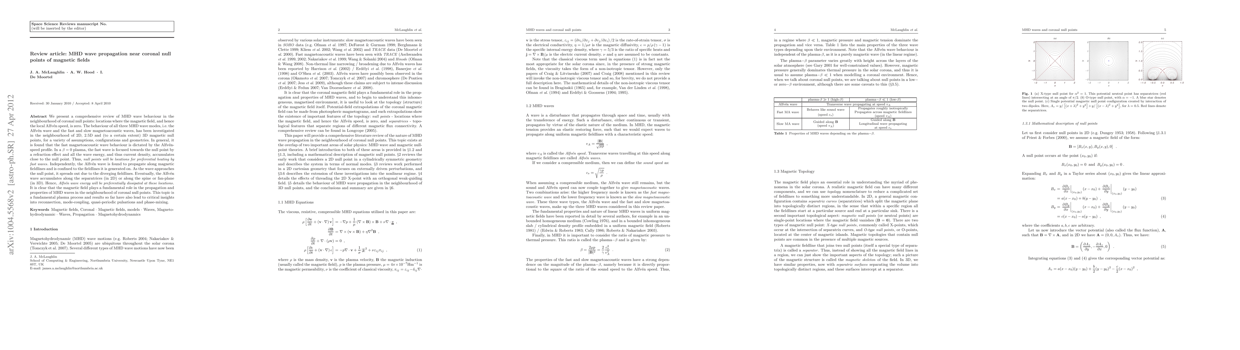 This review investigates MHD wave propagation near coronal null points, where the magnetic field is zero. The study finds that fast magnetoacoustic waves are focused towards the null point, leading to preferential heating, while Alfven waves spread out and accumulate along fieldline structures, indicating preferential dissipation. The magnetic field's geometry fundamentally influences wave behavior, providing insights into reconnection and related phenomena.