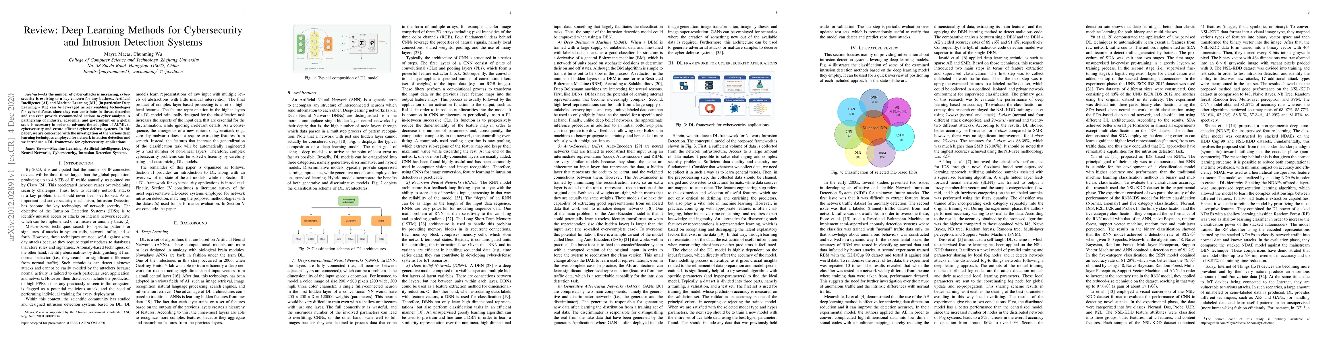 This paper reviews deep learning methods for cybersecurity, focusing on their application in network intrusion detection. It proposes a deep learning framework for enhancing cyber defense systems and emphasizes the need for collaboration among industry, academia, and government to advance AI/ML adoption in cybersecurity.