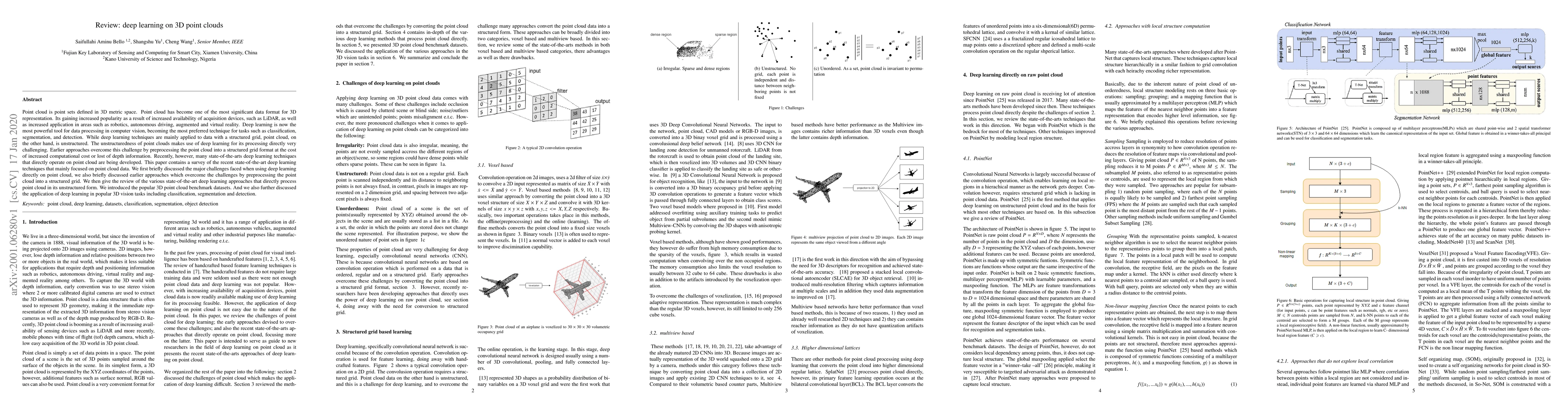 This paper surveys recent advancements in deep learning techniques for processing 3D point clouds directly, addressing the challenges of their unstructured nature. It reviews state-of-the-art methods, benchmark datasets, and applications in tasks like classification, segmentation, and detection.