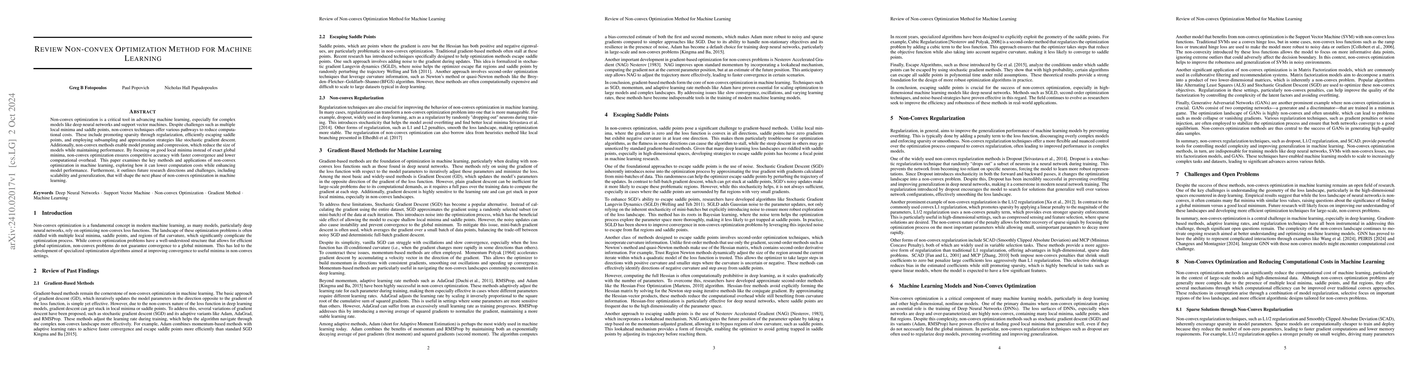 This paper reviews non-convex optimization techniques for machine learning, highlighting their role in reducing computational costs and improving model efficiency through methods like regularization and stochastic gradient descent. It emphasizes the trade-off between accuracy and convergence speed, and discusses future research challenges in scalability and generalization.