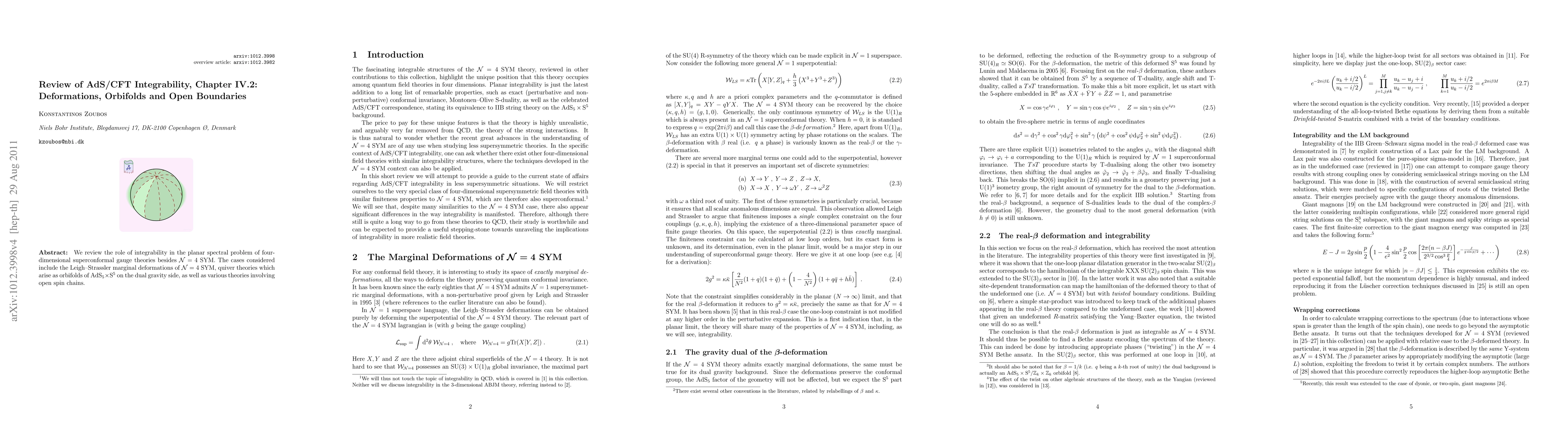 We review the role of integrability in the planar spectral problem of four-dimensional superconformal gauge theories besides N=4 SYM. The cases considered include the Leigh-Strassler marginal deformations of N=4 SYM, quiver theories which arise as orbifolds of AdS5xS5 on the dual gravity side, as well as various theories involving open spin chains.