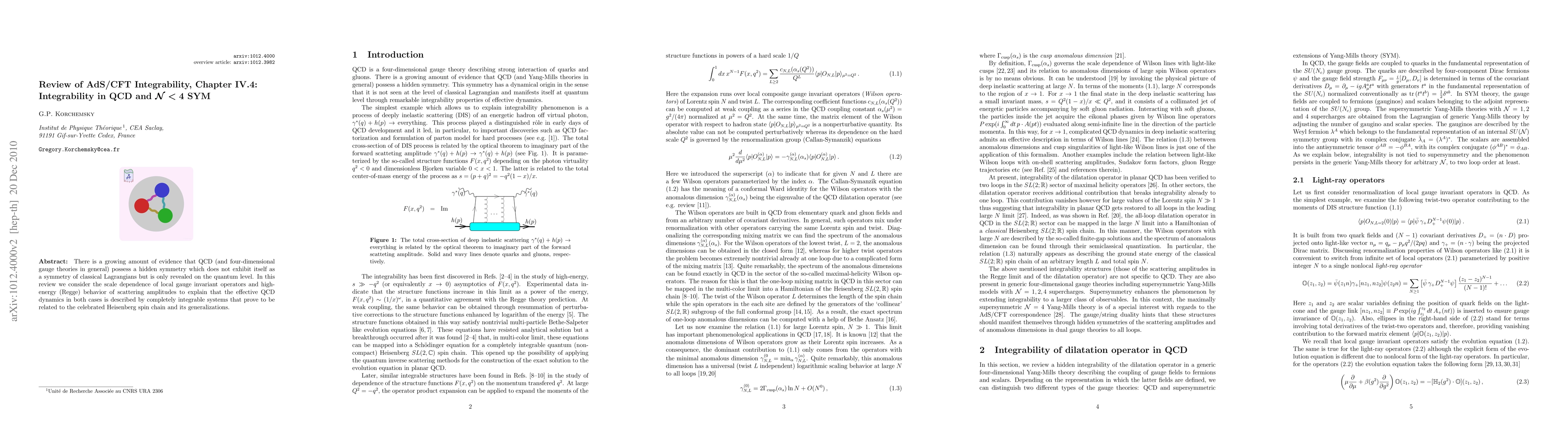 There is a growing amount of evidence that QCD (and four-dimensional gauge theories in general) possess a hidden symmetry which does not exhibit itself as a symmetry of classical Lagrangians but is only revealed on the quantum level. In this review we consider the scale dependence of local gauge invariant operators and high-energy (Regge) behavior of scattering amplitudes to explain that the effective QCD dynamics in both cases is described by completely integrable systems that prove to be related to the celebrated Heisenberg spin chain and its generalizations.