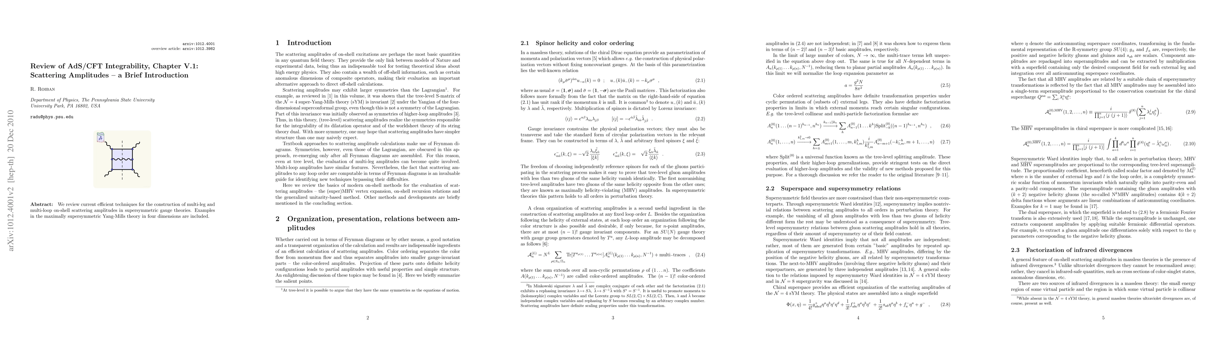 This paper reviews modern techniques for constructing multi-leg and multi-loop scattering amplitudes in supersymmetric gauge theories, focusing on maximally supersymmetric Yang-Mills theory in four dimensions. It highlights efficient methods used in the context of AdS/CFT integrability.