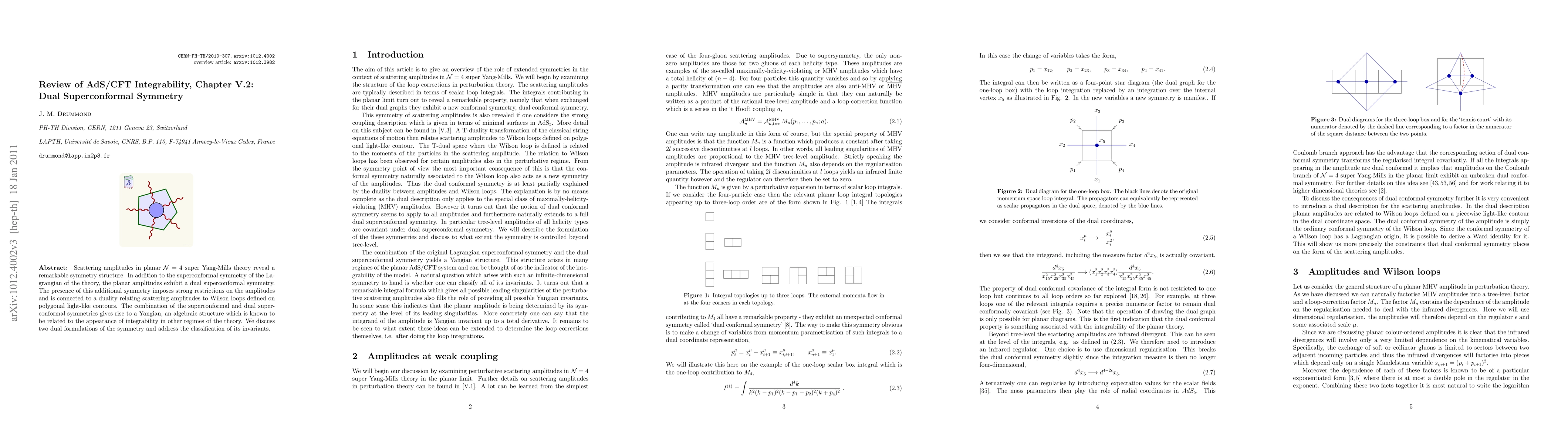 This paper reviews the integrability in AdS/CFT through the dual superconformal symmetry in planar N=4 super Yang-Mills theory, revealing strong restrictions on scattering amplitudes and linking them to Wilson loops. It explores the algebraic structure known as the Yangian, which arises from the combination of superconformal and dual superconformal symmetries.