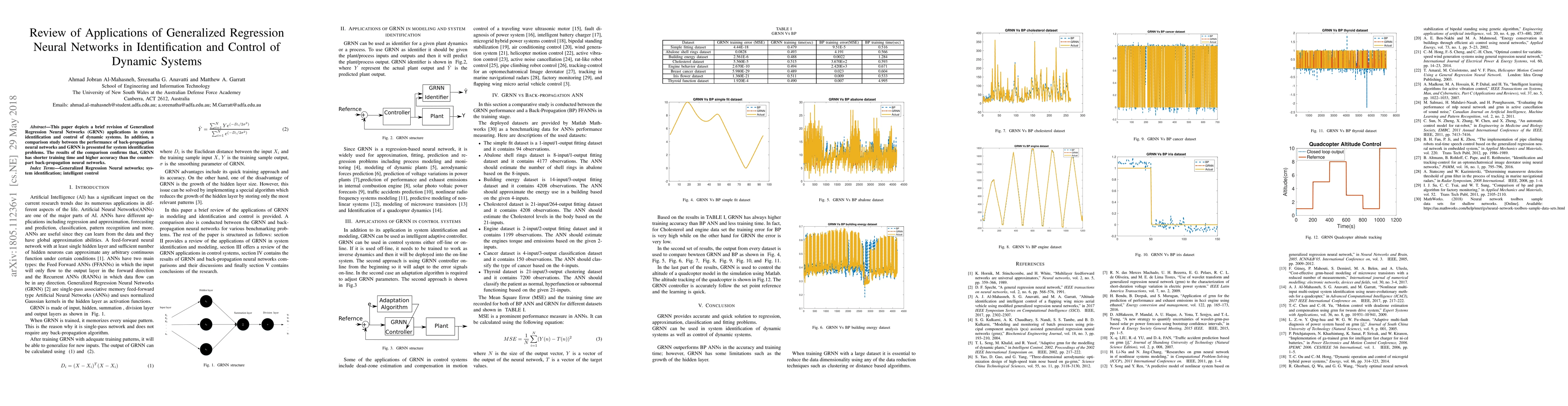 This paper reviews Generalized Regression Neural Networks (GRNN) applications in dynamic system identification and control, comparing their performance to back-propagation neural networks. Results show GRNN has shorter training times and higher accuracy for system identification tasks.
