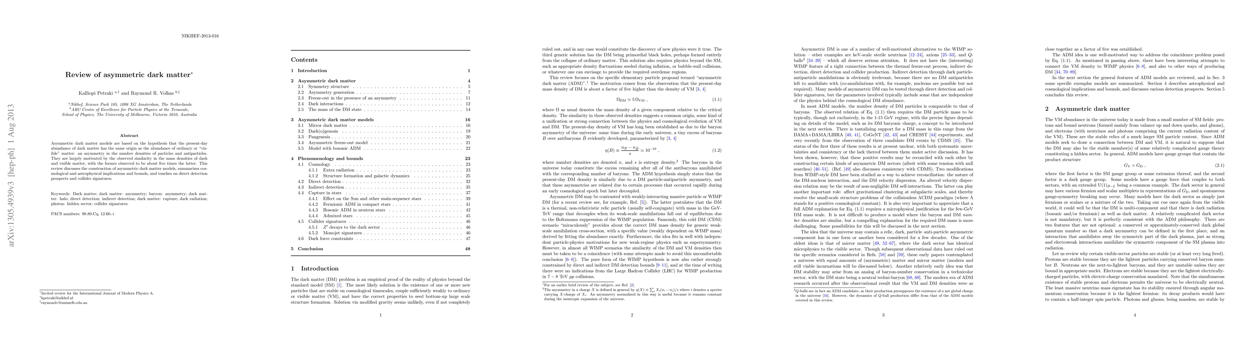 This review explores asymmetric dark matter models, which posit that the dark matter abundance mirrors the asymmetry between ordinary matter and antimatter. It examines their construction, cosmological implications, and potential detection methods.