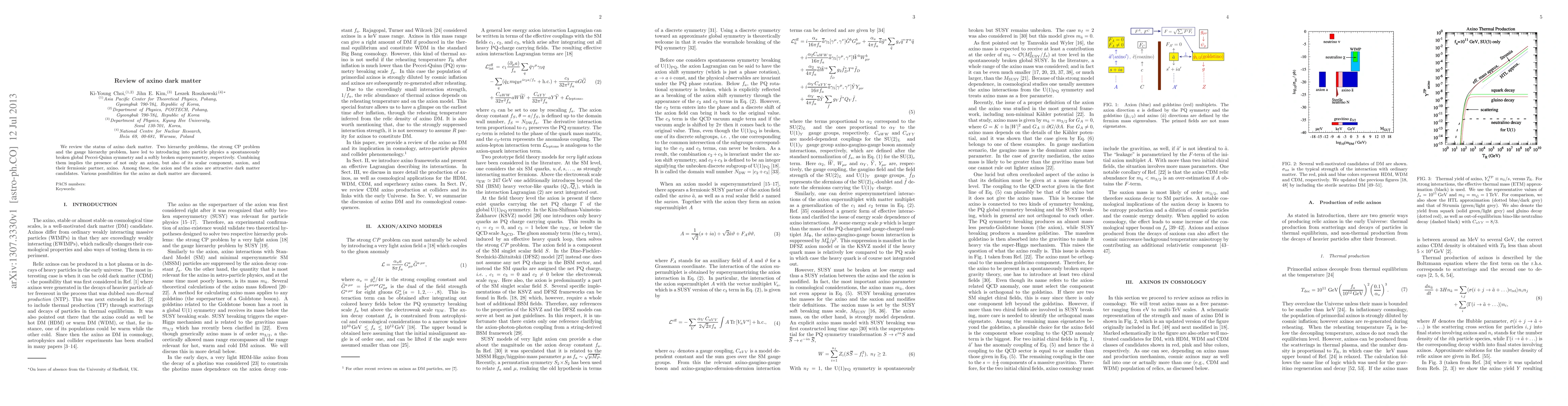 This paper reviews the potential of axinos as dark matter candidates, arising from the combination of Peccei-Quinn symmetry and supersymmetry, which address the strong CP and gauge hierarchy problems. Various possibilities for axino dark matter are explored.
