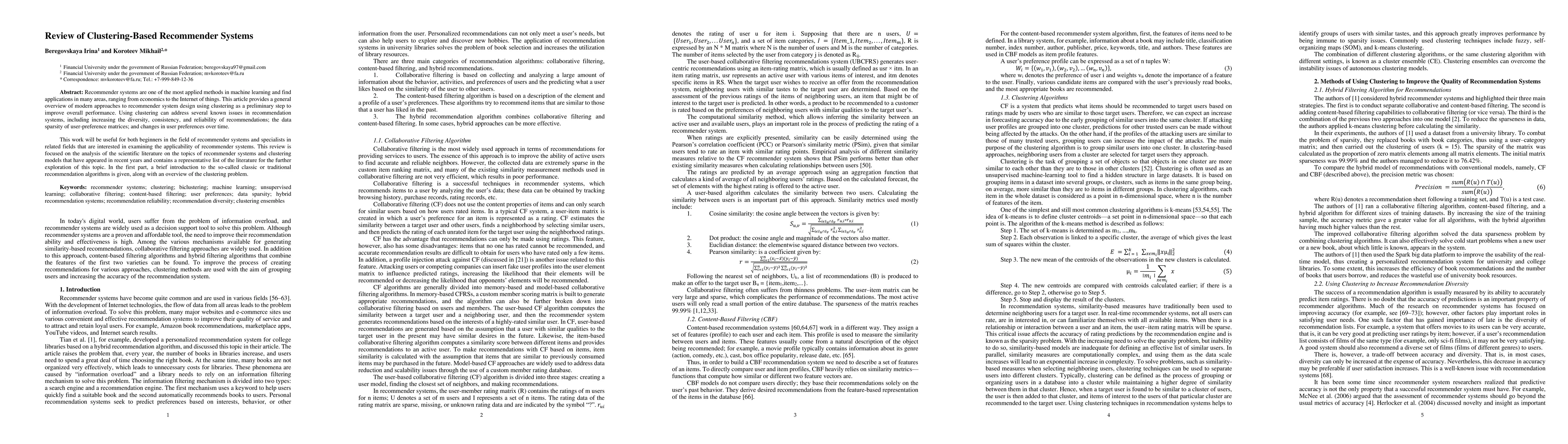 This review is valuable for both beginners and specialists in recommender systems, offering insights into the applicability and effectiveness of clustering-based approaches in addressing common challenges in recommendation systems.
