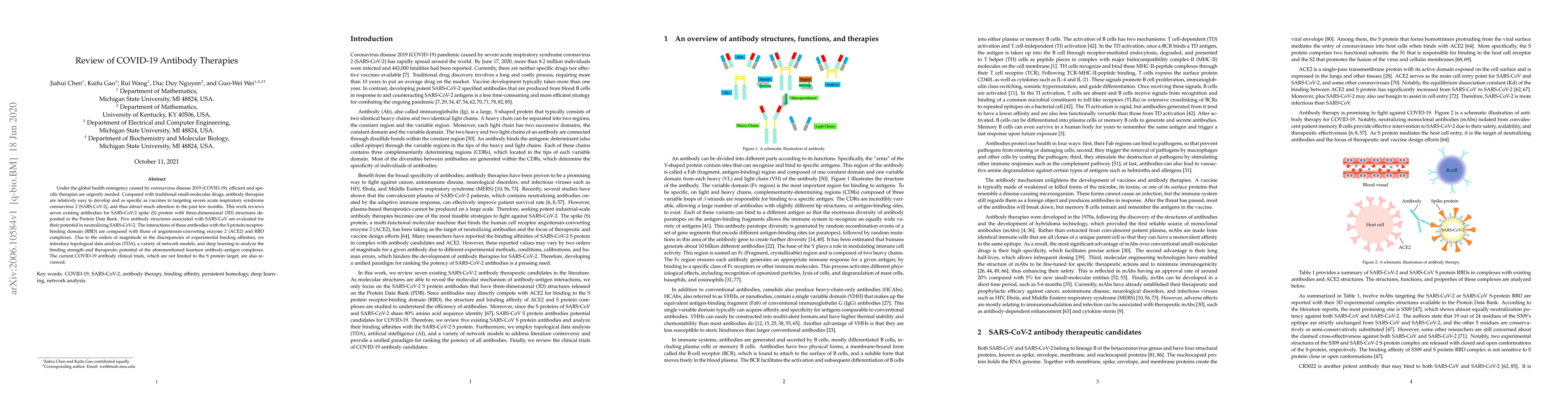 This paper reviews seven antibodies targeting SARS-CoV-2 spike protein and evaluates five SARS-CoV antibodies for neutralizing SARS-CoV-2, comparing their interactions with the spike protein receptor-binding domain (RBD) to ACE2-RBD complexes. The study employs topological data analysis and deep learning to assess binding strength and therapeutic potential, and also reviews ongoing COVID-19 antibody clinical trials.