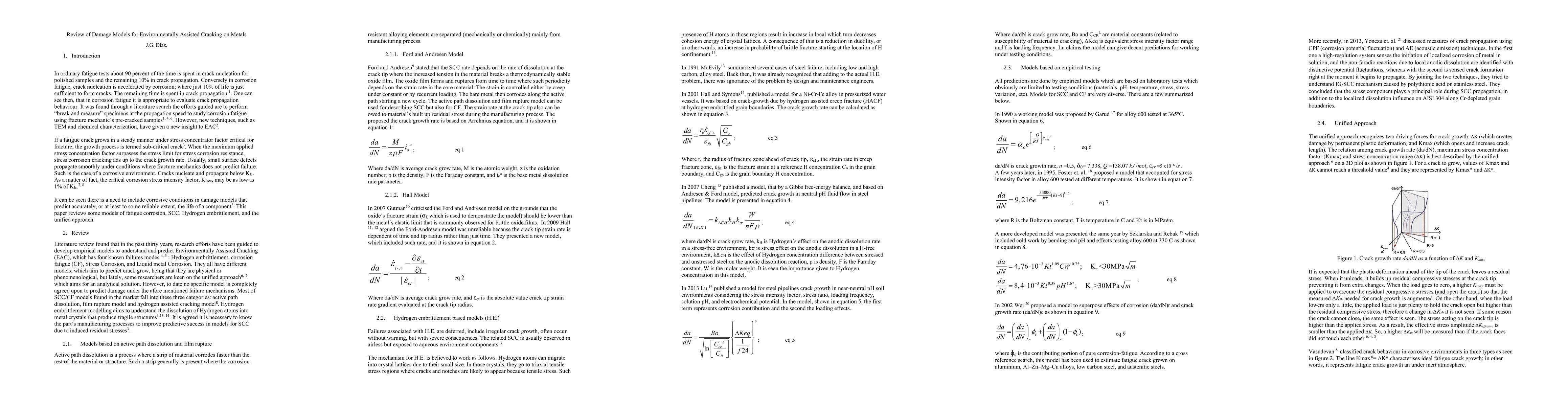This paper reviews various damage models for predicting environmentally assisted cracking in metals, focusing on stress corrosion cracking (SCC) under humidity and mechanical stress. It discusses models based on path dissolution, film rupture, hydrogen embrittlement, and a unified approach that considers the stress intensity factor range rather than the maximum value.