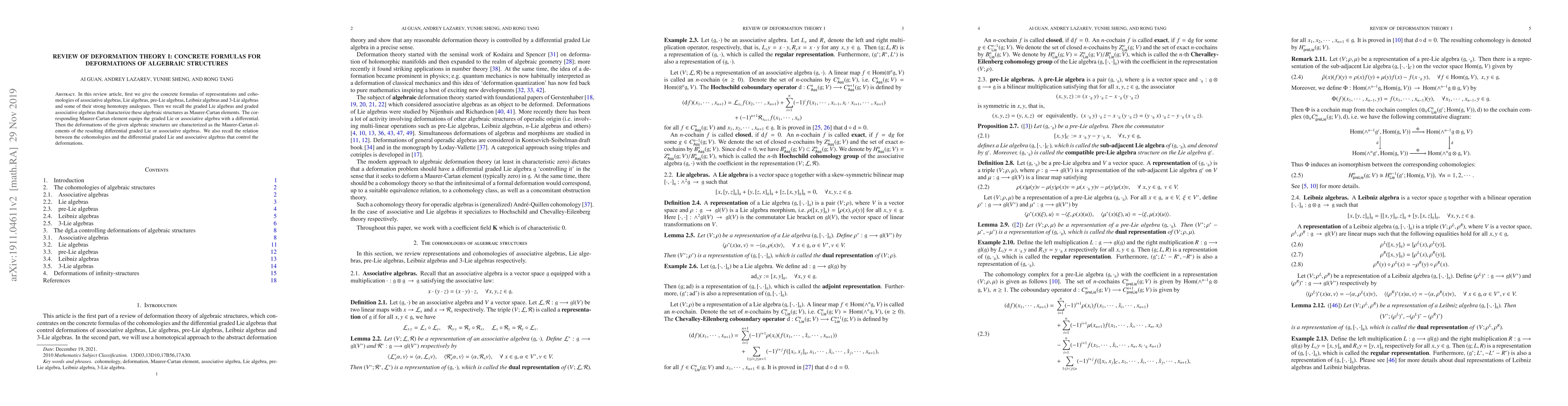 This review article provides concrete formulas for the representations and cohomologies of various algebraic structures, including associative, Lie, pre-Lie, Leibniz, and 3-Lie algebras, along with their strong homotopy analogues. It also discusses the role of graded Lie and associative algebras in characterizing these structures via Maurer-Cartan elements and their relation to deformations.
