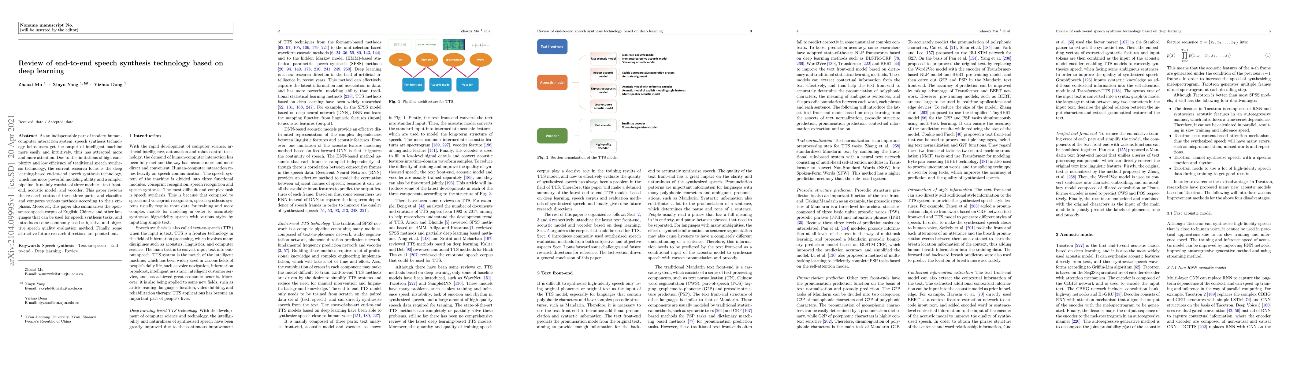 This paper reviews deep learning-based end-to-end speech synthesis technologies, focusing on three main modules: text front-end, acoustic model, and vocoder. It also discusses open-source speech corpora and evaluation methods, and highlights future research directions.