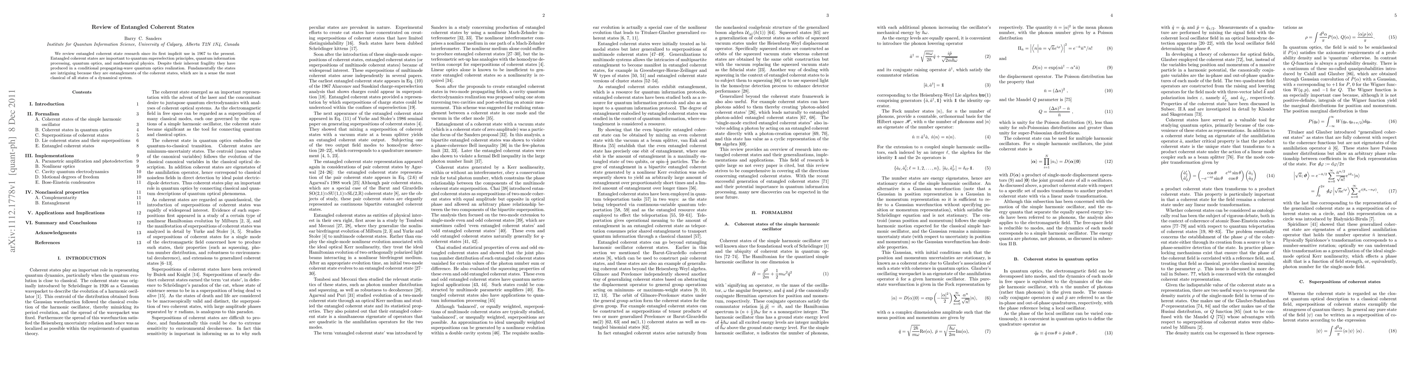 We review entangled coherent state research since its first implicit use in 1967 to the present. Entangled coherent states are important to quantum superselection principles, quantum information processing, quantum optics, and mathematical physics. Despite their inherent fragility they have produced in a conditional propagating-wave quantum optics realization. Fundamentally the states are intriguing because they are entanglements of the coherent states, which are in a sense the most classical of all states of a dynamical system.