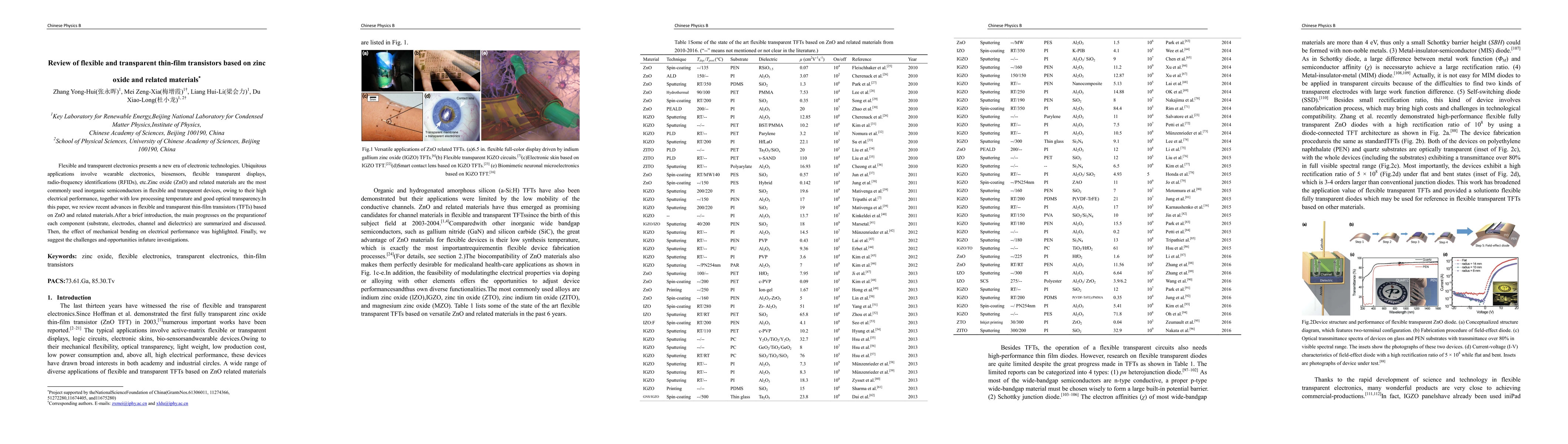 Flexible and transparent electronics presents a new era of electronic technologies. Ubiquitous applications involve wearable electronics, biosensors, flexible transparent displays, radio-frequency identifications (RFIDs), etc.Zinc oxide (ZnO) and related materials are the most commonly used inorganic semiconductors in flexible and transparent devices, owing to their high electrical performance, together with low processing temperature and good optical transparency.In this paper, we review recent advances in flexible and transparent thin-film transistors (TFTs) based on ZnO and related materials.After a brief introduction, the main progresses on the preparation of each component (substrate, electrodes, channel and dielectrics) are summarized and discussed. Then, the effect of mechanical bending on electrical performance was highlighted. Finally, we suggest the challenges and opportunities in future investigations.
