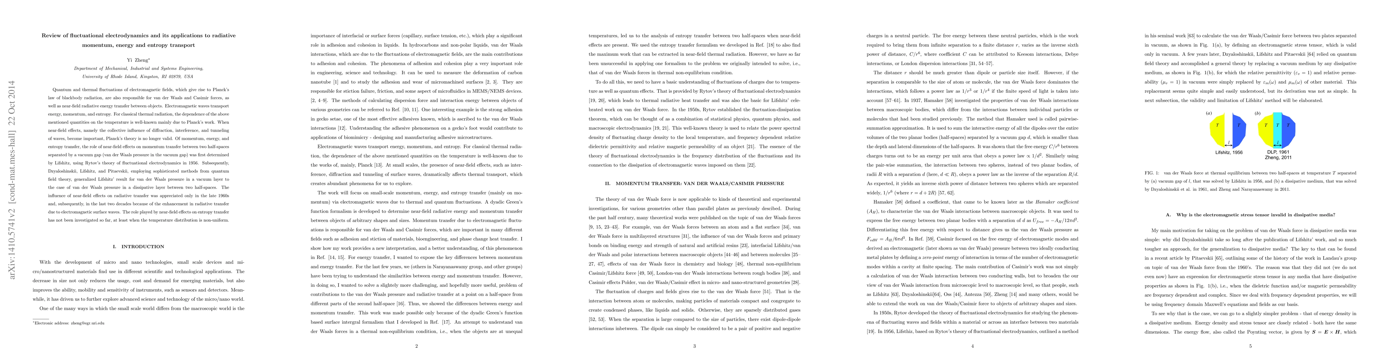 Quantum and thermal fluctuations of electromagnetic fields, which give rise to Planck's law of blackbody radiation, are also responsible for van der Waals and Casimir forces, as well as near-field radiative energy transfer between objects. Electromagnetic waves transport energy, momentum, and entropy. For classical thermal radiation, the dependence of the above mentioned quantities on the temperature is well-known mainly due to Planck's work. When near-field effects, namely the collective influence of diffraction, interference, and tunneling of waves, become important, Planck's theory is no longer valid. Of momentum, energy, and entropy transfer, the role of near-field effects on momentum transfer between two half-spaces separated by a vacuum gap (van der Waals pressure in the vacuum gap) was first determined by Lifshitz, using Rytov's theory of fluctuational electrodynamics in 1956. Subsequently, Dzyaloshinskii, Lifshitz, and Pitaevskii, employing sophisticated methods from quantum field theory, generalized Lifshitz' result for van der Waals pressure in a vacuum layer to the case of van der Waals pressure in a dissipative layer between two half-spaces. The influence of near-field effects on radiative transfer was appreciated only in the late 1960s and, subsequently, in the last two decades because of the enhancement in radiative transfer due to electromagnetic surface waves. The role played by near-field effects on entropy transfer has not been investigated so far, at least when the temperature distribution is non-uniform.
