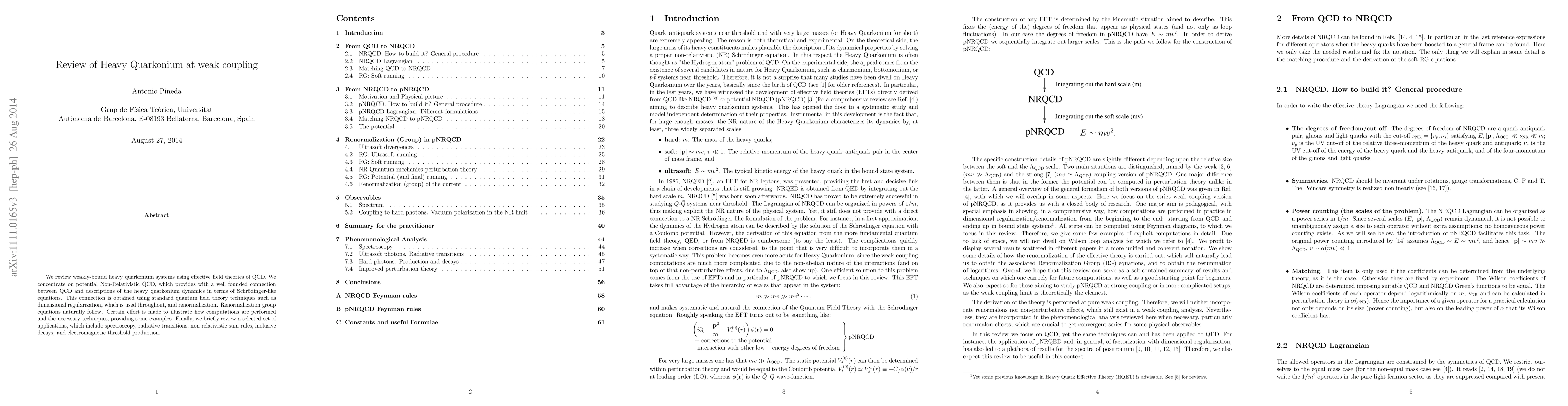 This paper reviews the weakly-bound heavy quarkonium systems using effective field theories of QCD, focusing on potential Non-Relativistic QCD to bridge QCD and Schrödinger-like equations. It details computational techniques and applications including spectroscopy and electromagnetic threshold production.
